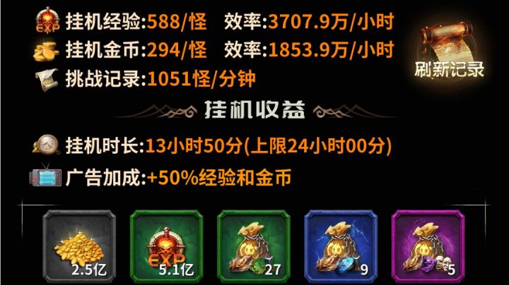 最新0.6.1版本关于挂机经验这一块我做个说明哈,玩过游戏的都知道,我们的挂机经验和金币收益是和挂机地图的挑战记录相关的,在之前的版本里面,在拿到了高记录的时候,玩家一直在线是不会拿到这些收益的,必须要玩家去离线(在线刷图托管,遗迹那些经验效率远远是达不到离线的收益的,因为离线收益是按照最高的收益去计算的),这就导致在线的玩家,升级很难,逼着离线,然后之前的经验包和金币包的收益约等于没有,特别是后