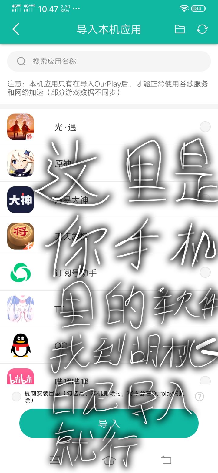 进不去闪退的看着里www首先你得下一个ourplay里面会让你下3个服务什么的,等他下好就可以啦(打开ourplay后看上面他让你下的那3个玩意)下完后登录账号,点进去之后点左下角创建账号,为我自己创建,然后就开始你的操作🌚登好之后退出点导入,进去后找到胡桃日记导入就行了(里面自带更新功能,就不用来TapTap来更新啦ww谷歌账号是要💰💰的🌚