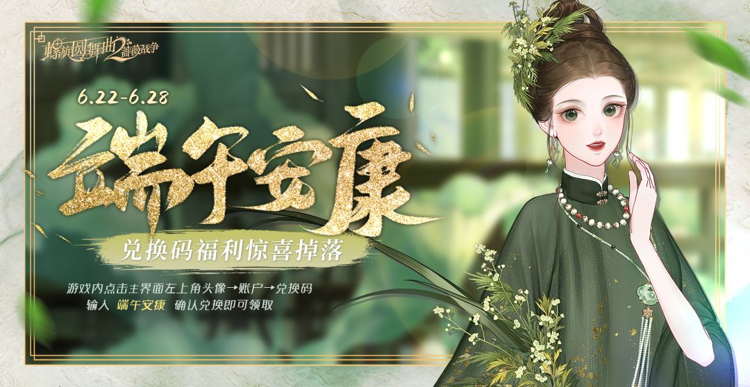 飞龙行云,祥云如意,满含着祝愿祈福之意。 将艾草菖蒲和花朵拢成一束悬于门前,有驱虫辟邪之用。 在【粽香端午】活动期间,每位大小姐都能领取一份端午贺礼! 礼物内容:钻石*100+花叶券*1+金币*10W 使用方法:点击左上角头像→账户→兑换码,输入【端午安康】确认兑换即可领取 注意事项: 1.兑换码仅输入文字即可,不需要输入【】符号; 2.每个角色只可领取一次; 3.兑换码有效期:即日起至6月