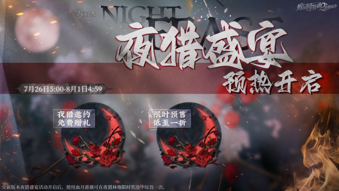活动时间:7月26日5:00-8月1日4:59 活动一:夜猎邀约 活动期间,商城限时上架「夜猎邀约」系列免费礼包,内含血月蔷薇*5及多种资源道具奖励。 活动二:预售礼包 活动期间,商城限时上架「夜猎预售」系列折扣礼包,最低可至1折,内含血月蔷薇、钻石等珍稀道具。 *全新版本「夜猎盛宴」活动开启后,使用血月蔷薇可在夜猎林地限时奖池中绽放一次。 ✨—爱与舞曲 永不停歇—✨ 官网: 公众号:螺旋
