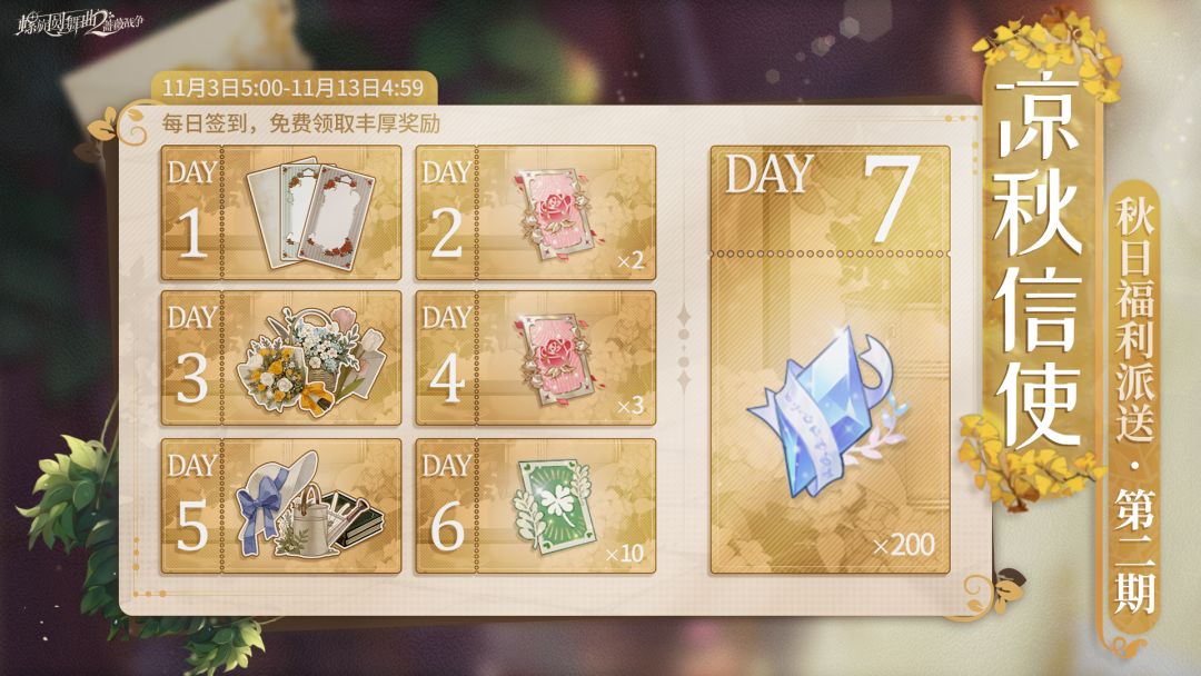 霜染枫红,转眼已是暮秋啦~ 活动时间:11月3日5:00-11月13日4:59 活动内容: 活动期间,每日登录游戏完成凉秋七日签到,可累计免费获得瑰梦券*5、钻石*200、秋日限定贴纸等丰厚奖励。 *详情请以游戏内活动公告为准 (ฅ´ω`ฅ) ✨—爱与舞曲 永不停歇—✨ 官网: 公众号:螺旋圆舞曲2-蔷薇战争 官方微博:螺旋圆舞曲2-蔷薇战争 B站:螺旋圆舞曲2-蔷薇战争