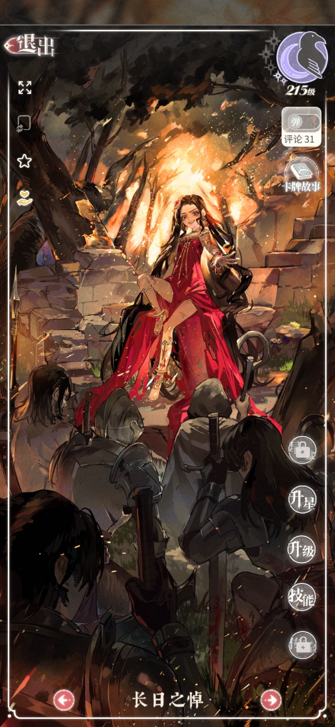 偌大的论坛居然没有一贴通关攻略,让刚玩这个游戏的新手玩家摸索得好辛苦! 先上简单总结:全力养红女王,借好友高星高级红女王援助,吃暴击饭赌暴击率 首先!请大家记住图片的这张平民神卡《长日之悼》,昵称“红女王”。没错,就是新手前期即使抽不出,装修花园都会送你一张的“红女王”。 然后,请狠狠地把所有资源砸到这张卡上!让卡片等级,技能都达到你所在等级的上限值!前期自选卡也要选它,尽量把星级弄到三星! 最后