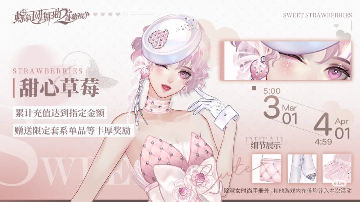 活动一:午后牧场7月1日5:00-8月1日4:59,点击主界面「抽奖」进入「午后牧场」奖池,使用「野餐篮」抽取活动限定套装【和风待我】、限定卡牌【心照不宣的秘密】。每15次绽放至少获得1件未拥有的限定套装【和风待我】部件;每75次绽放至少获得1张限定卡牌【心照不宣的秘密】。活动二:累充回馈7月1日5:00-8月1日4:59,累计充值达到指定金额,即可领取对应丰厚奖励,共计7个档位。累充