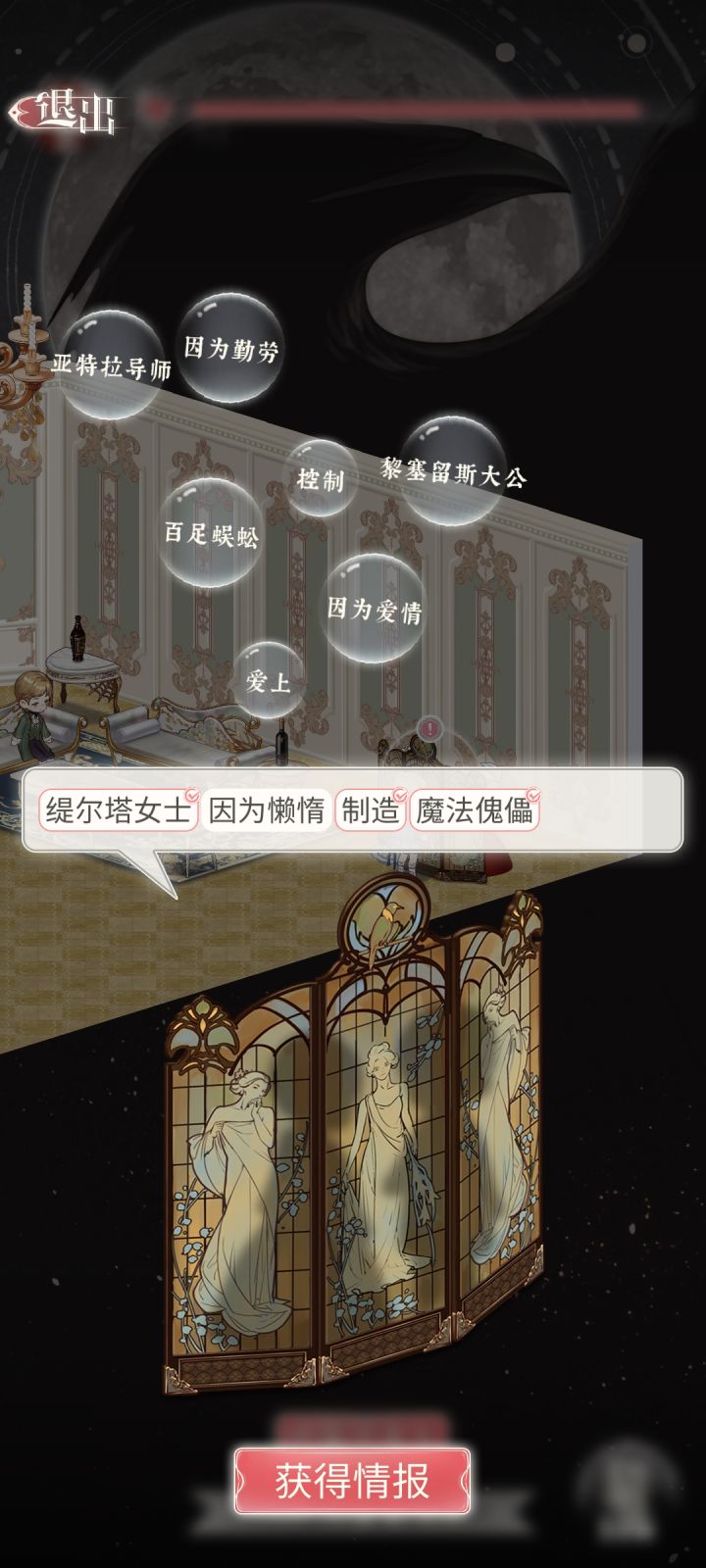 纪录帖,有几个挺好玩的(◍•ᴗ•◍)全部白色就是对的,红色就是错的。大部分还是有逻辑的,不行的话多试试注:不是每次出现相同的情报空格都会一样。图1:英尼提亲王(黑历史)图2:克伦克+维纶长官图3:缇尔塔女生 魔法傀儡(我想学这个ಠ_ಠ)图4:星期四傍晚 酒吧图5:杰欣特图6:贝利亚•阿尔钦(祝你成功)图7:魔法学院+夜族图8:灵异事件+图门家族图9:红丝绒房间