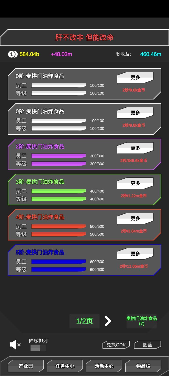 大家好,我是《肝到发慌》游戏的作者~目前,该游戏已经完成了一部分游戏内容的制作,本文将说一下目前已经完成了哪些功能~首先需要说一下,这个游戏仅仅是一个打发空余时间的游戏,用于消磨时间,会在近日开测哦~这个游戏,对肝的要求极为苛刻,只有看广告才能获取额外奖励,无收费内容,要么肝,要么欧,要么看广告!1. 产业园如果玩过《不正经的骗肝》,那么应该知道这个玩法,主要是建造产业,雇员升级来获得金