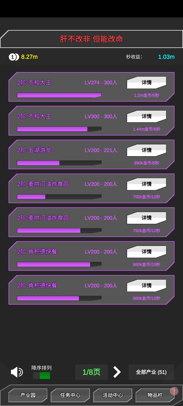 大家好,我是《肝到发慌》游戏的作者~目前,该游戏已经完成了一部分游戏内容的制作,本文将说一下目前已经完成了哪些功能~首先需要说一下,这个游戏仅仅是一个打发空余时间的游戏,用于消磨时间,会在近日开测哦~这个游戏,对肝的要求极为苛刻,只有看广告才能获取额外奖励,无收费内容,要么肝,要么欧,要么看广告!1. 产业园如果玩过《不正经的骗肝》,那么应该知道这个玩法,主要是建造产业,雇员升级来获得金