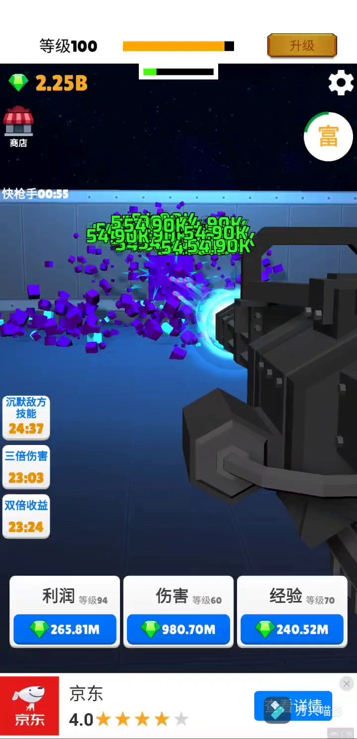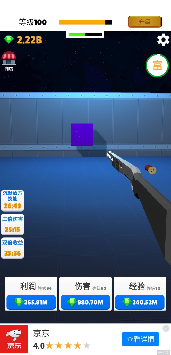 很不错啦,平时无聊玩玩这种小游戏,消磨一下时间。广告肯定有,毕竟人家要恰饭,能理解。玩到100级,所有枪械全部解锁。效果还行,加特林冒着小蓝火哒哒哒哒,推荐试玩呐,哈哈哈