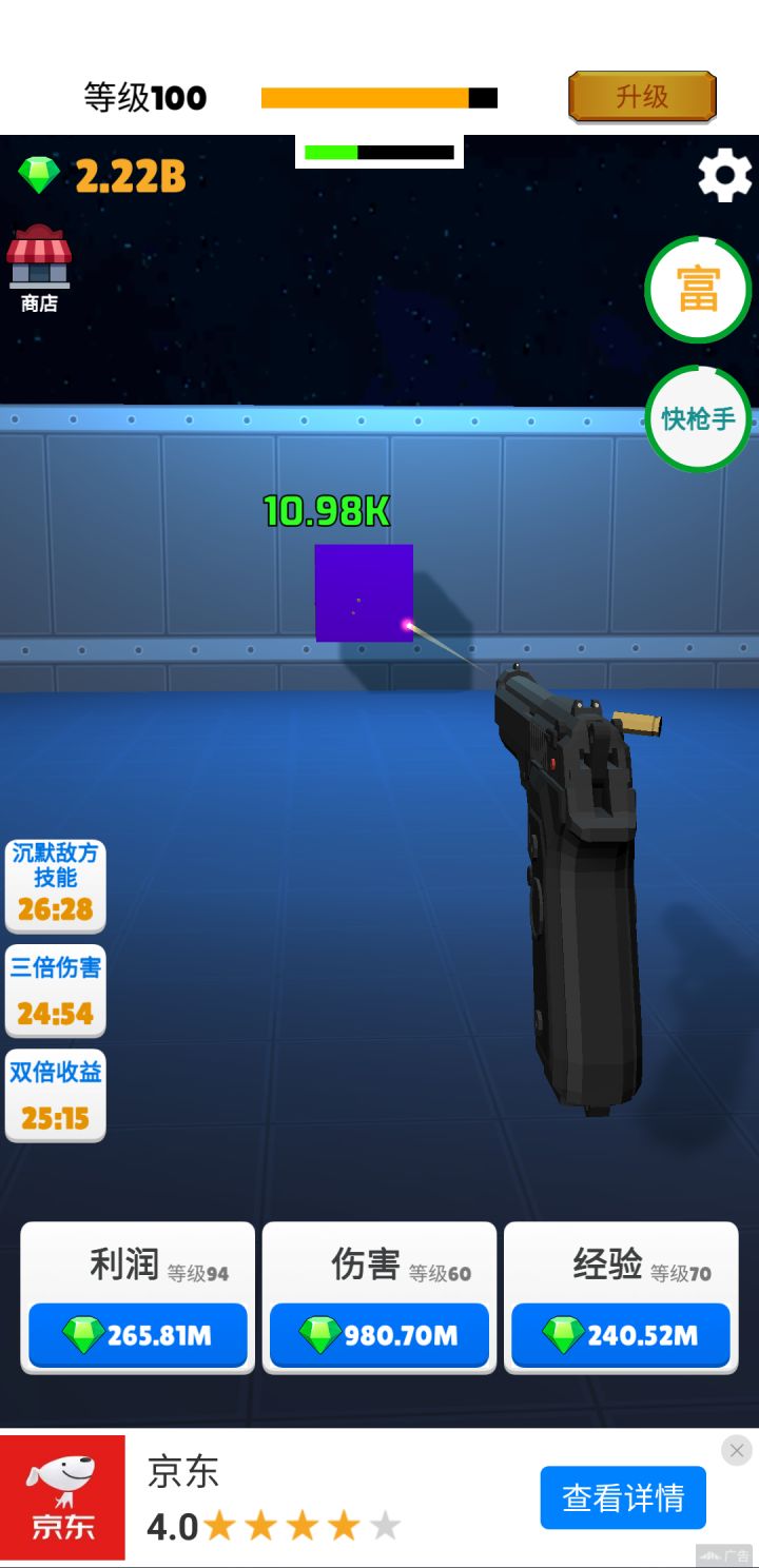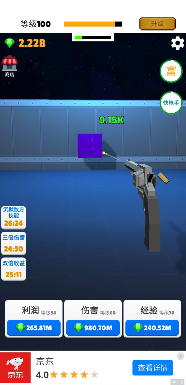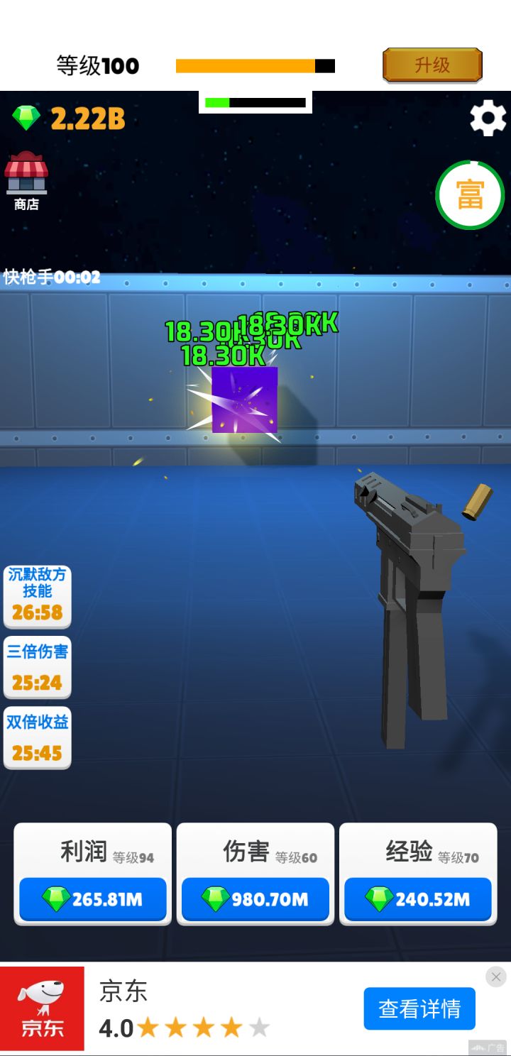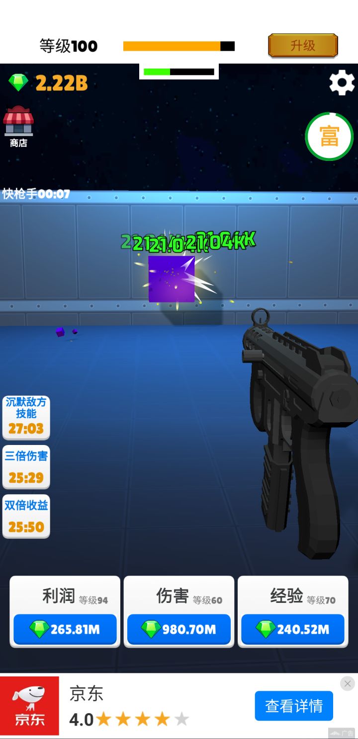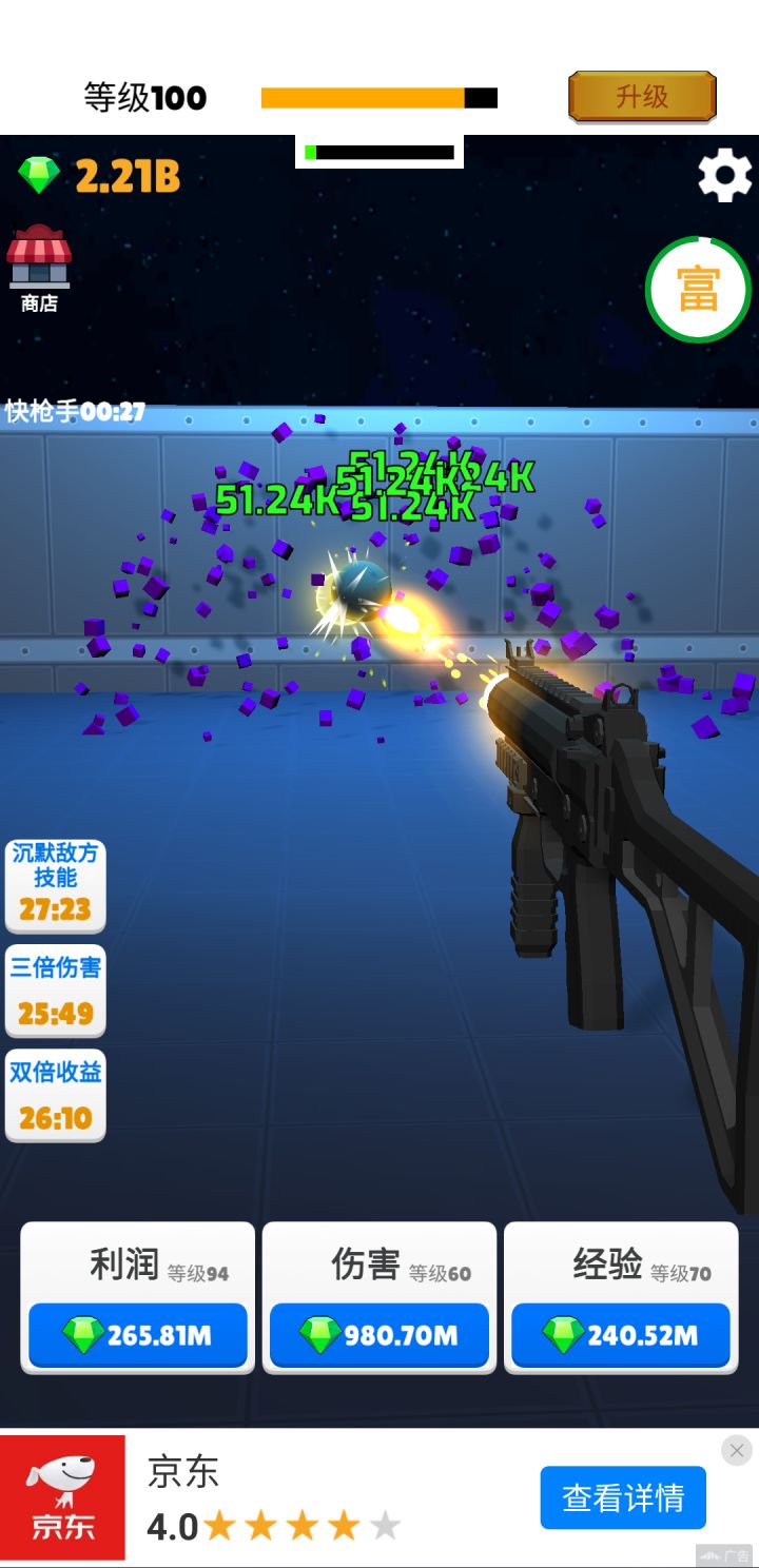 40级后通过快枪手不断看广告增强攻击力。钻石优先加利润>伤害>经验。利润等级越高,大富豪收益越大。离线收益也多。