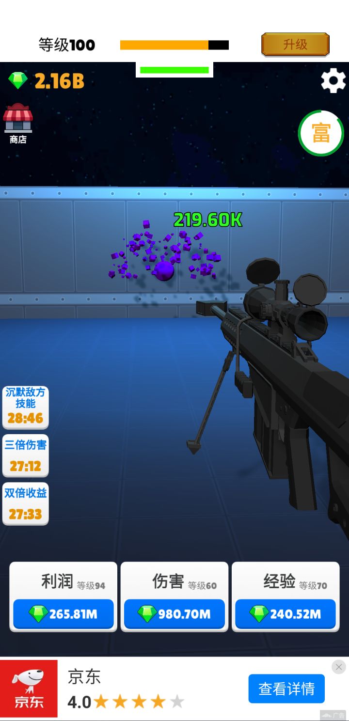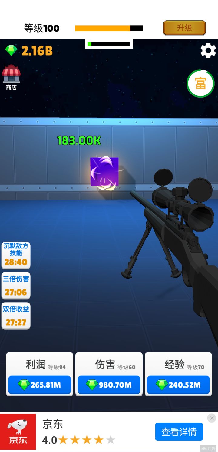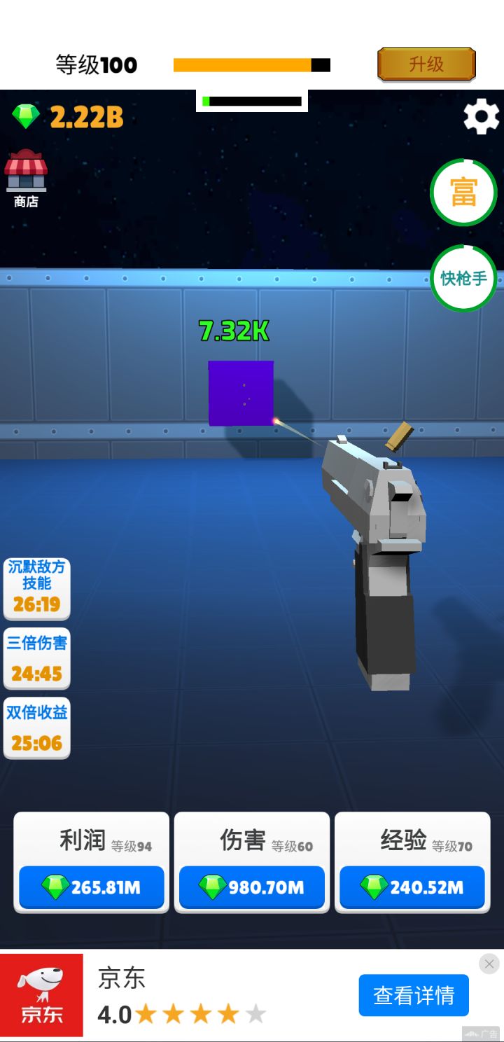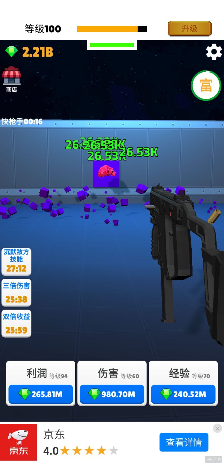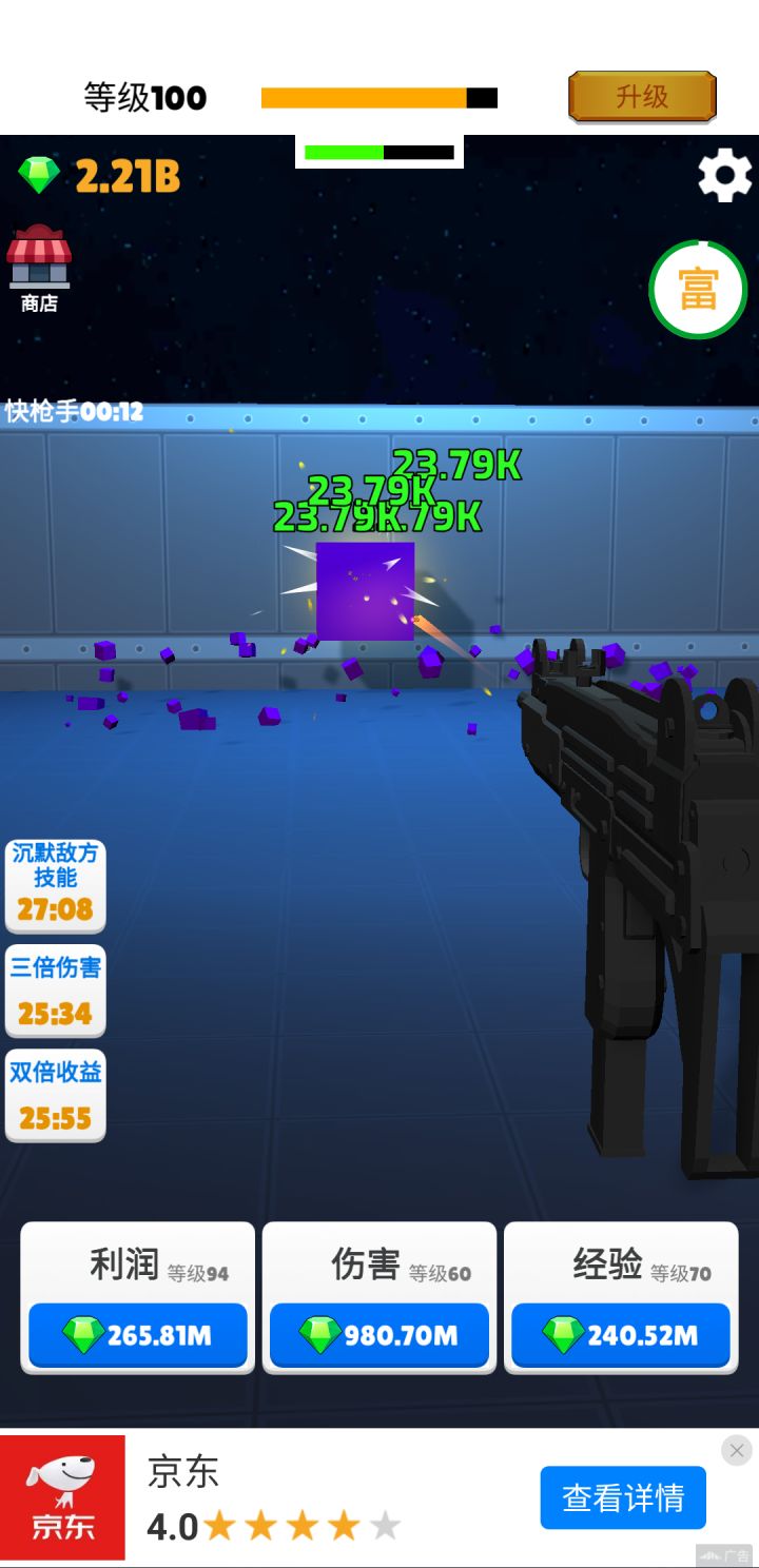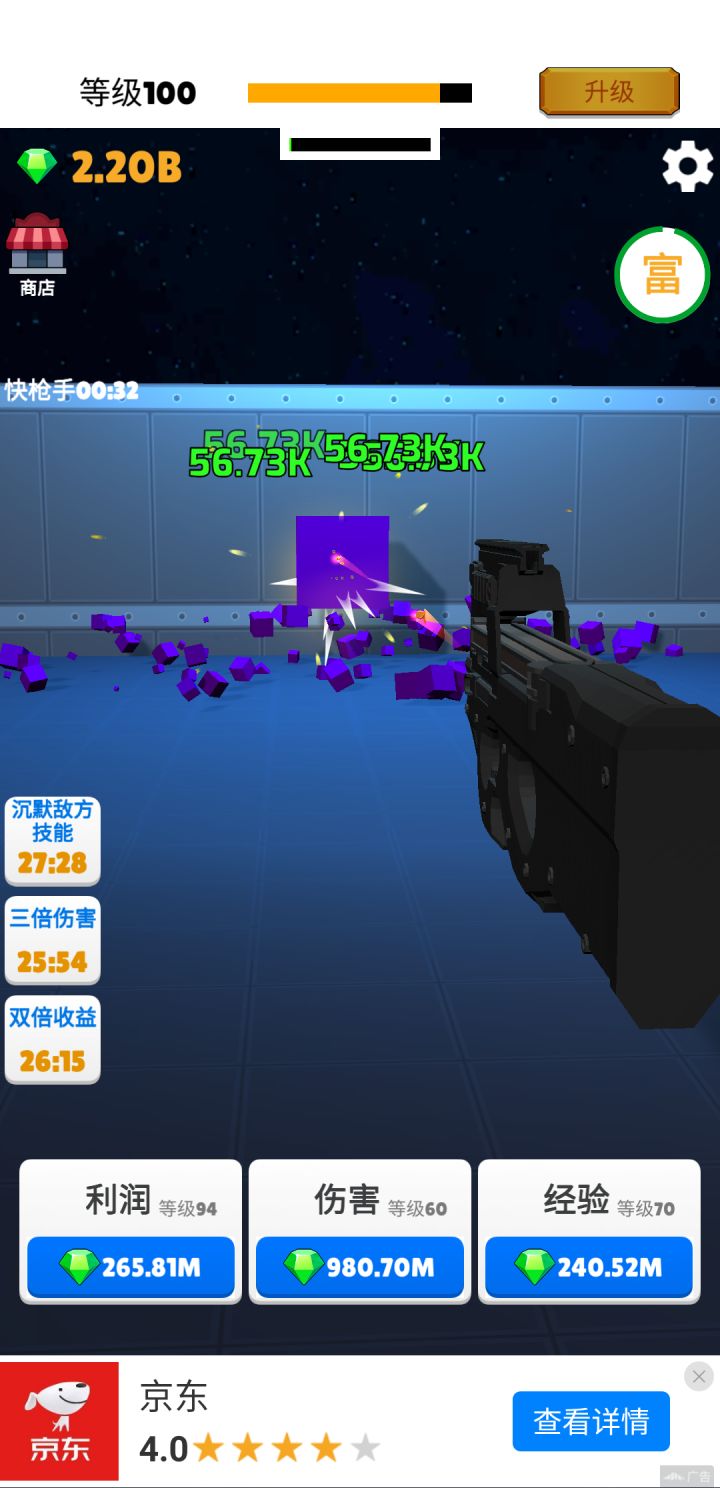 40级后通过快枪手不断看广告增强攻击力。钻石优先加利润>伤害>经验。利润等级越高,大富豪收益越大。离线收益也多。
