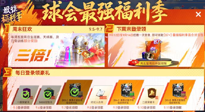 兄弟们,玩两个月比别人玩一年的福利还多的机会千万不要错过!52个球员包!300连抽全部免费到手!