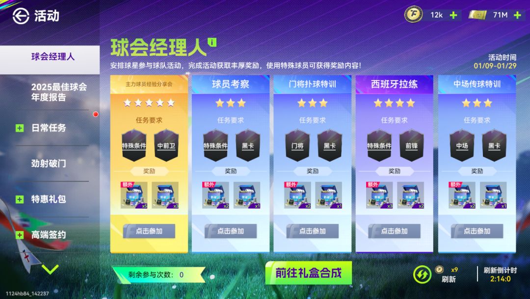 首先是球探 球探卡按照星级可以分成1-6星,按照类型可以分成国家、位置、联赛与俱乐部、能力、年龄、身高、体重等。 主帅可以在自己的球探库里选择三个不同类型的球探卡进行球员搜索。不过我建议各位主帅进入球员配方按照想要配方来搜索球员。 各位主帅也可以在球探解雇页面解雇多余的球探卡,获得的球探币可以在球探卡商店中购买到刷新出来的球探卡。 除了球探商店以外,游戏内很多活动都能获得球探卡,各位主帅可以多多探