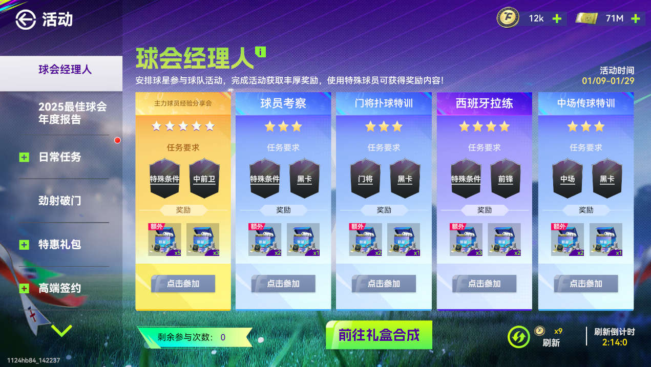 半程领跑冲冠路,七日累登送好礼 年度回顾 五大联赛半程冠军 亚洲杯青年赛,青春当“燃”不让 年度射手王刮刮卡 焦点战 1月5日10:00-1月18日23:59期间点击游戏内活动入口,即可一键生成你的年度专属报告。回顾你的最佳时刻。查看并分享报告即可获得【83+】年末狂欢混合球员包。分享有礼,福利升级!将你的报告页面分享给好友,成功邀请3位主帅查看报告即可获得【85+】年末狂欢混合球员包!扫描上