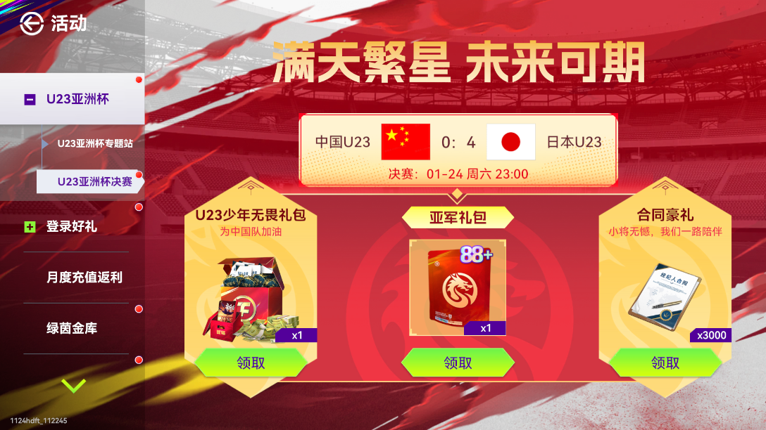 1.24 23:00 都来看#u23亚洲杯 中日决战 夺冠球会发90+包!!国足U23冲啊!!!#最佳球会