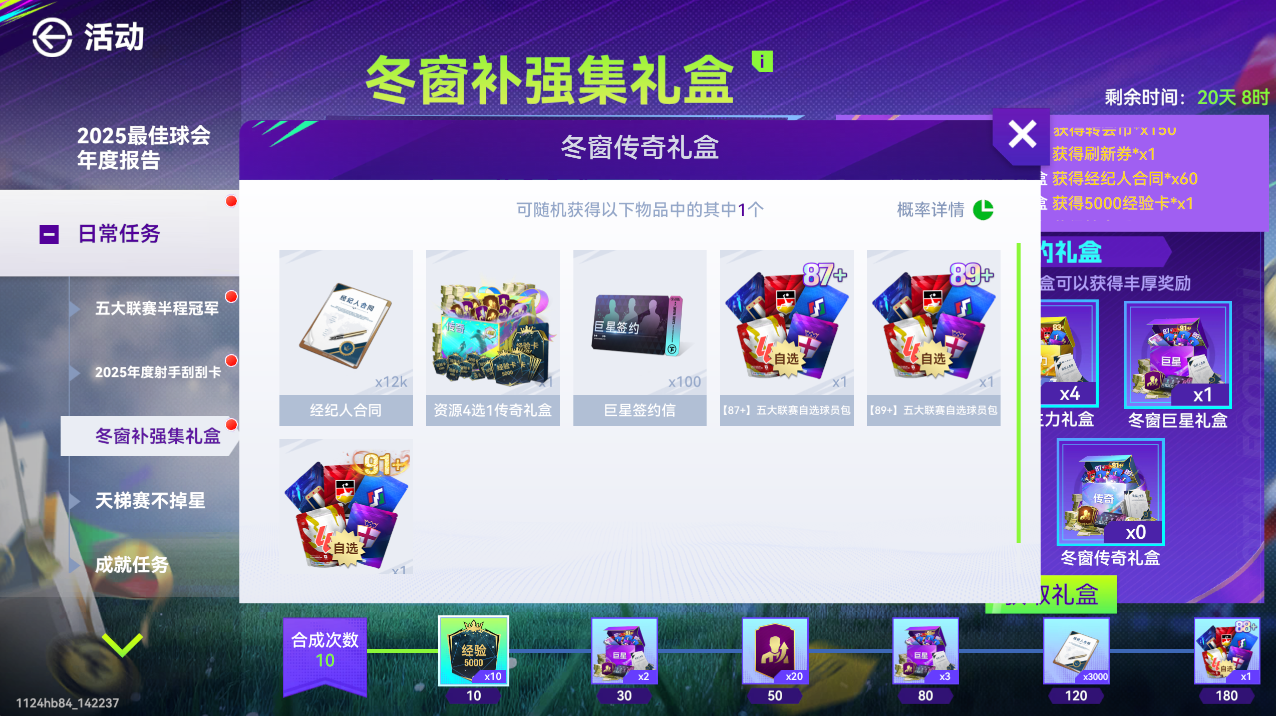 球会今天上了个新活动《冬窗补强集礼盒》,玩法参考“合成大西瓜”模式,为纯肝向活动,奖励随礼盒等级提升逐步丰厚。🎯 活动核心玩法✅ 合成规则:每5个低等级礼盒可合成1个高等级礼盒,礼盒等级越高,开启后可获得的奖励价值越高。✅ 核心目标:若想在活动结束前兑换最高等级礼盒,全程需累计攒够625个最低等级的“新星礼盒”,折算下来活动期间每日至少需获取32个新星礼盒。💪 每日礼盒获取渠道▪️ 日常