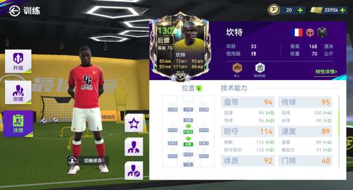 先说结论:这张坎特其实并没有想象中那么好用!!目前我的是7星70级坎特,玩的是英超队套,这个坎特相当于外援了,我将从优点和缺点两方面给大家介绍一波!缺点:防守和体力没有想象中那么好,我的这张坎特加了很多点在抢断和防守意识上,抢断112,防守意识115还有预判抢断特性加持,但是这张坎特的预判特性很难触发,不知道咋回事;同时坎特体力94+铜铁人,按道理来说体力是够的,但实际体验下来达到80分钟后还是