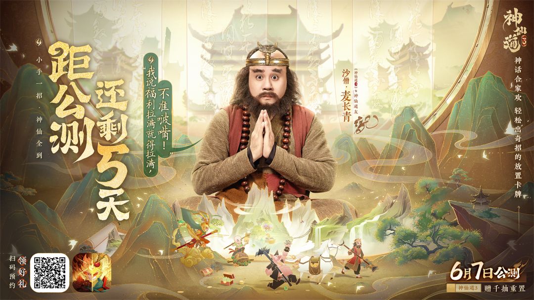 《神仙道3》全平台公测将于6月7日10:00开启! 为欢迎道友此番踏入仙途,小精卫精心准备了诸多福利在此恭候,助力道友名扬三界! ▌福利一、小手一招,神仙全到,免费送红卡斗战胜佛! ▌福利二、神仙团献礼,神仙送上六百抽,三期赠礼*每期200抽! ▌福利三、代言人司命仙女送福利,在线就能拿福利,并且每天首出极品必为心愿伙伴! ▌福利四、月光宝盒千抽召唤,百次十连任你选! ▌福利五、开服八天,每天登录