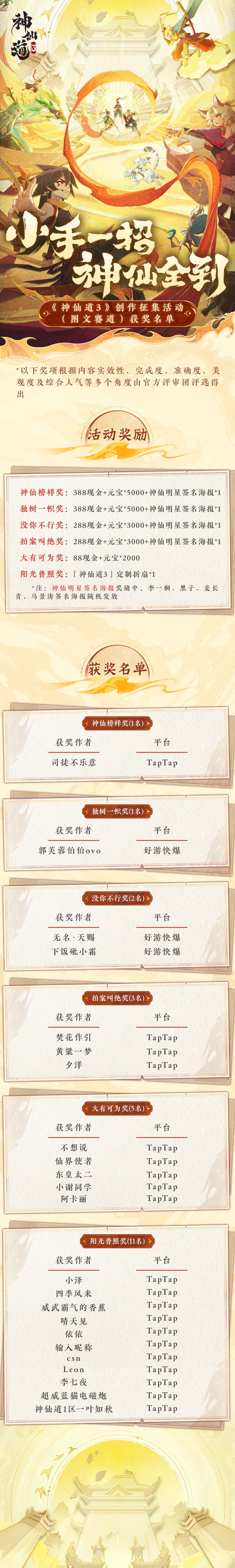 《神仙道3》公测已有一月有余,“小手一招,神仙全到”公测创作征集活动也圆满结束啦! 本次活动期间,我们收到了许多道友积极创作的优秀作品,经过多维度评估,在投稿中评选出了一批获奖作品,详细获奖名单请道友们点击下方长图查看~ - 图文赛道:奖励领取请在奖项公布后15天内联系官方Q群管理员(QQ号:1294112491)凭个人主页和获奖截图兑换奖励。 - 视频赛道:我们将于名单公示7个工作日内联系获奖道