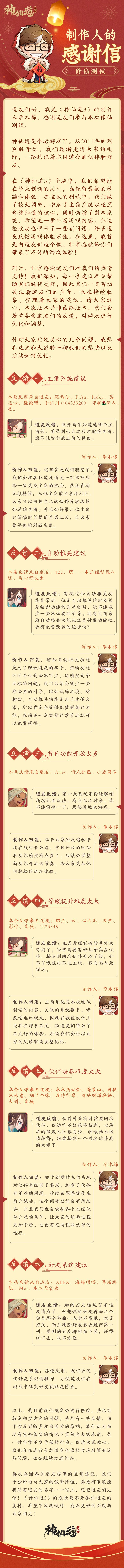 亲爱的道友们: 为期十四天的修仙测试已经告一段落;这几天,我们一直在细致梳理从各个渠道收集来的反馈和建议,感谢道友们一路以来的陪伴与支持!下面是一封来自制作人的感谢信,我们也想借这个机会,与大家同步一下后续的优化内容: