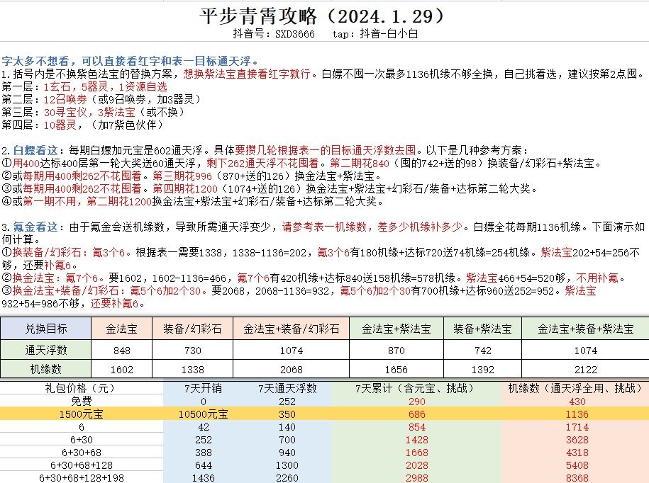 字太多可直接看红字和表一,注意器灵上期的消耗bug已修复导致开销变更,所以以新版本表格为准。 一些附加数据感兴趣的可以自己看看,可忽略 一、不换紫法宝: 第一层:1玄石(100返6),5器灵(60返30),1资源自选(80返6) 第二层:9召唤券(180返72),3器灵(72返24) 第三层:12寻宝仪(240返120),18寻宝仪(360返180) 第四层:10器灵(240返120),7紫色伙伴