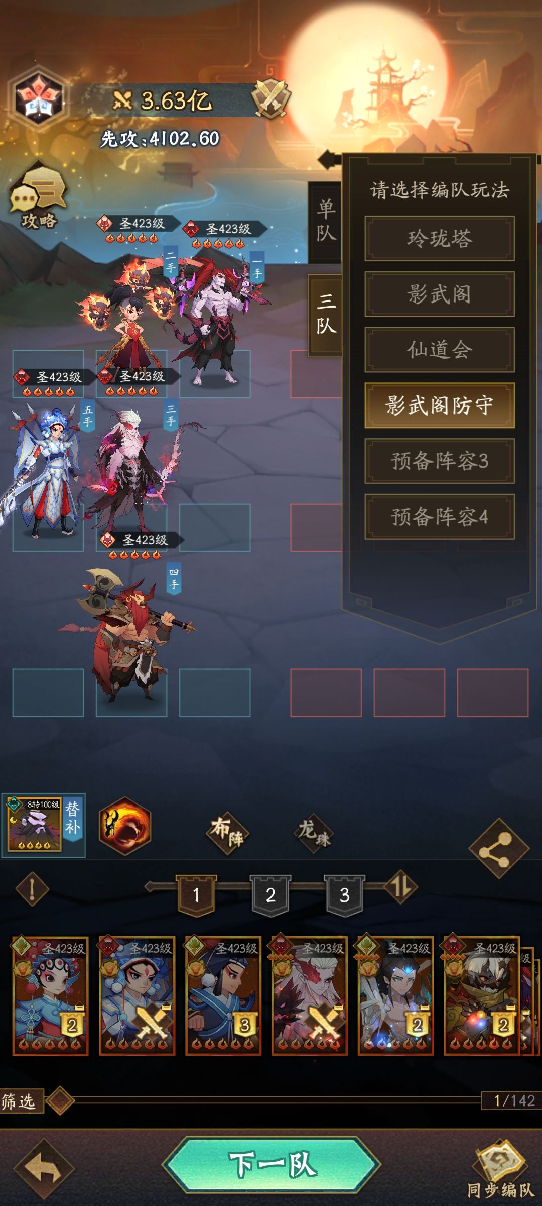 经过【第二阶段】的充分发育,此时太子长琴13星以上,黑白无常15星,剑灵15星,宝莲13星,魔君15星,进【第三阶段】。 1.【第三阶段】阵容建议 【神魔四保一】 剑灵+宝莲+太子+黑白+魔君 最低配置要求: 魔君15星30天相【日相】目眩金色强化+9 宝莲13星30天相【日相】叱咤红色强化+9,满共鸣 黑白15星30天相【月相】目眩金色 剑灵15星10天相【日相】 铜墙红