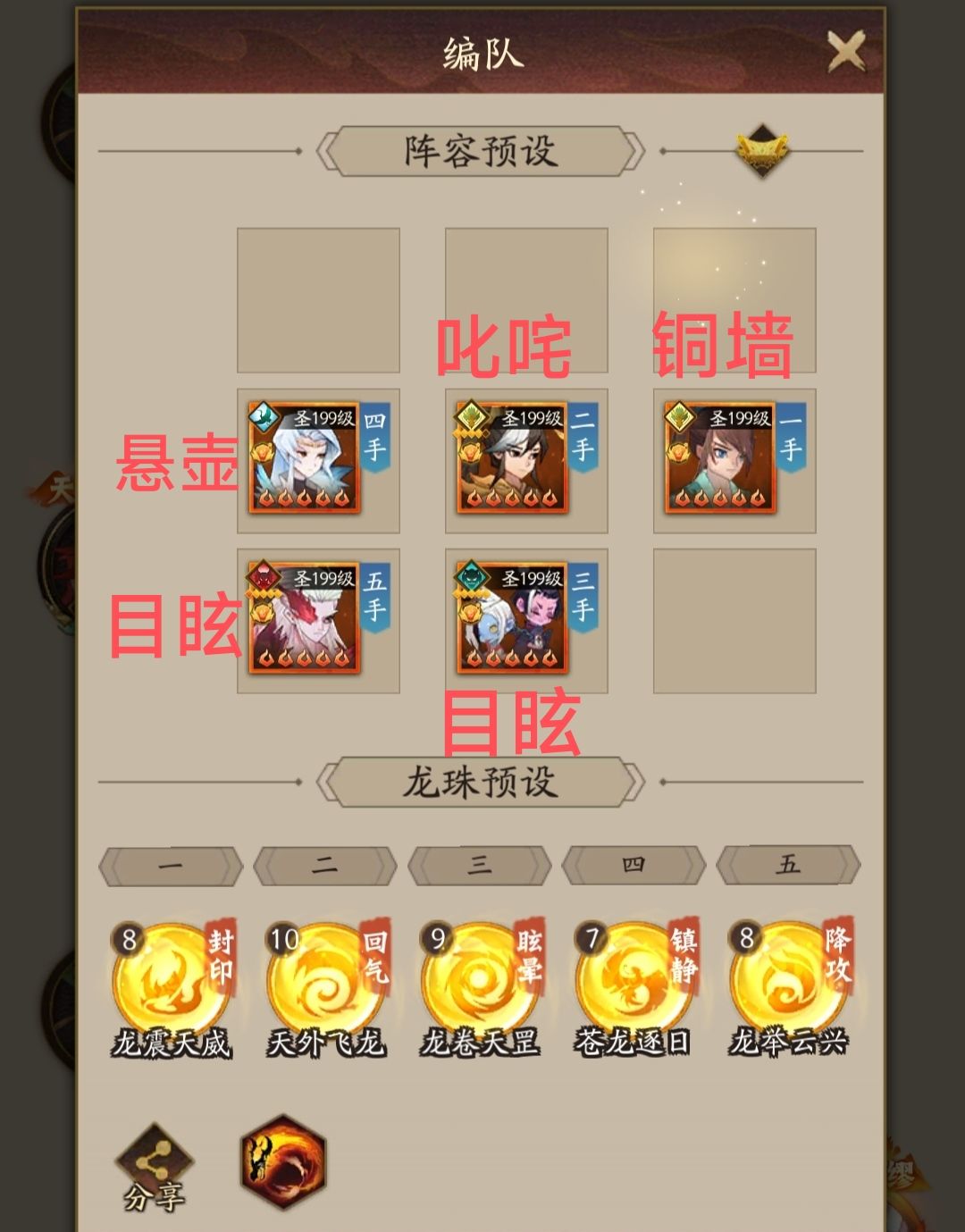 1.【单队最强阵容】【顶配魔君四保一】 1)【武圣+宝莲+逐日+麒麟+魔君】 替补:【石矶】/【小吹】/【红孩儿】 3)【周天配置】 进入第四阶段的首要条件是: 飞羽18周天+武圣9周天 慢慢把武圣奇门点到18周天 4)【字灵建议】 武圣 【铜墙铁壁】红色 +9满共鸣 第3优先级 宝莲 【叱咤风云】红色 +9满共鸣 第2优先级 逐日 【万寿无疆】红色+15满共鸣 第5优先级#攻略