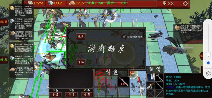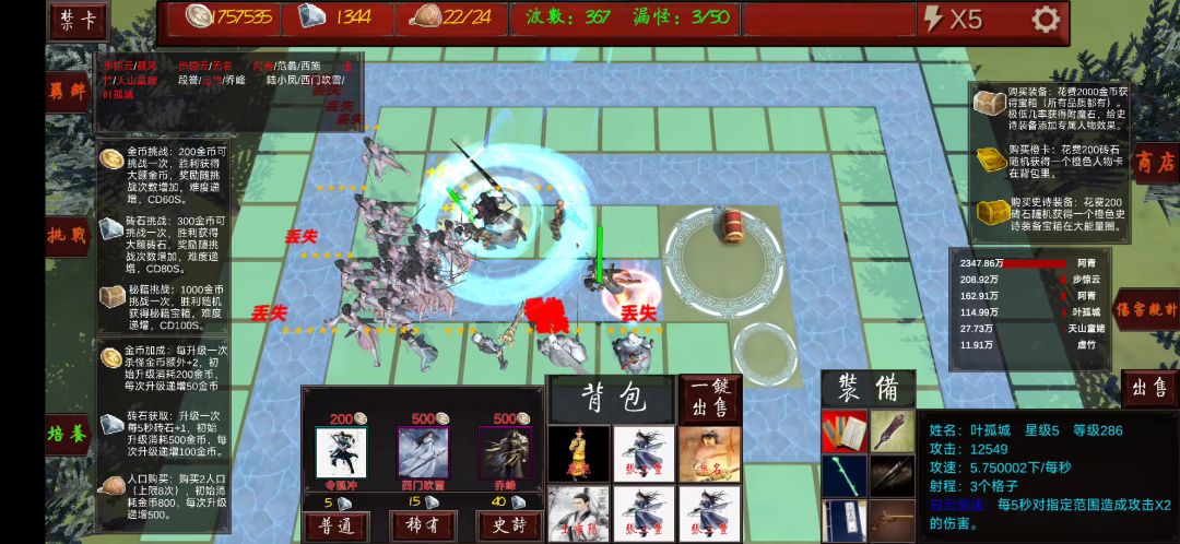 攻击方面,找aoe多的攻速快的能削血的,张无忌完美符合需求,虽然装备有真武剑15概率5%削血但是数值太低了,我建议还是四倚天,能加1攻速,击退和技能削血更明显,容错率也更高。