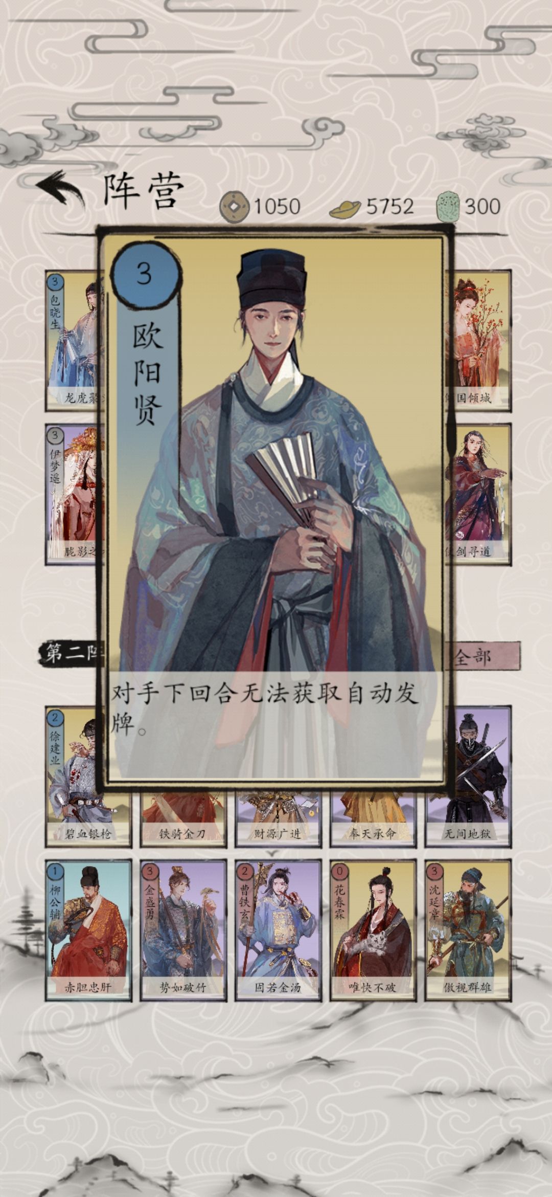 武侠卡牌冒险竞技游戏《包晓生英雄传》每周新英雄预告之欧阳贤,“秋月风来拂我心,人间错梦飞花里。”永乐阵营曝光第二位英雄,欧阳贤,大明殿试探花及第,大理段氏指法传人,运气好到让人怀疑在开挂,但这就是武侠爽文小说套路呀,无奇遇不江湖。 欧阳贤,所属阵营永乐,侠义会中的主薄,常与包晓生形影不离,随主角贯穿了三部本传小说。武功技能为:“沐家剑指”,技能效果为:“使得对手下回合无法获得系统的发牌。”欧阳贤的