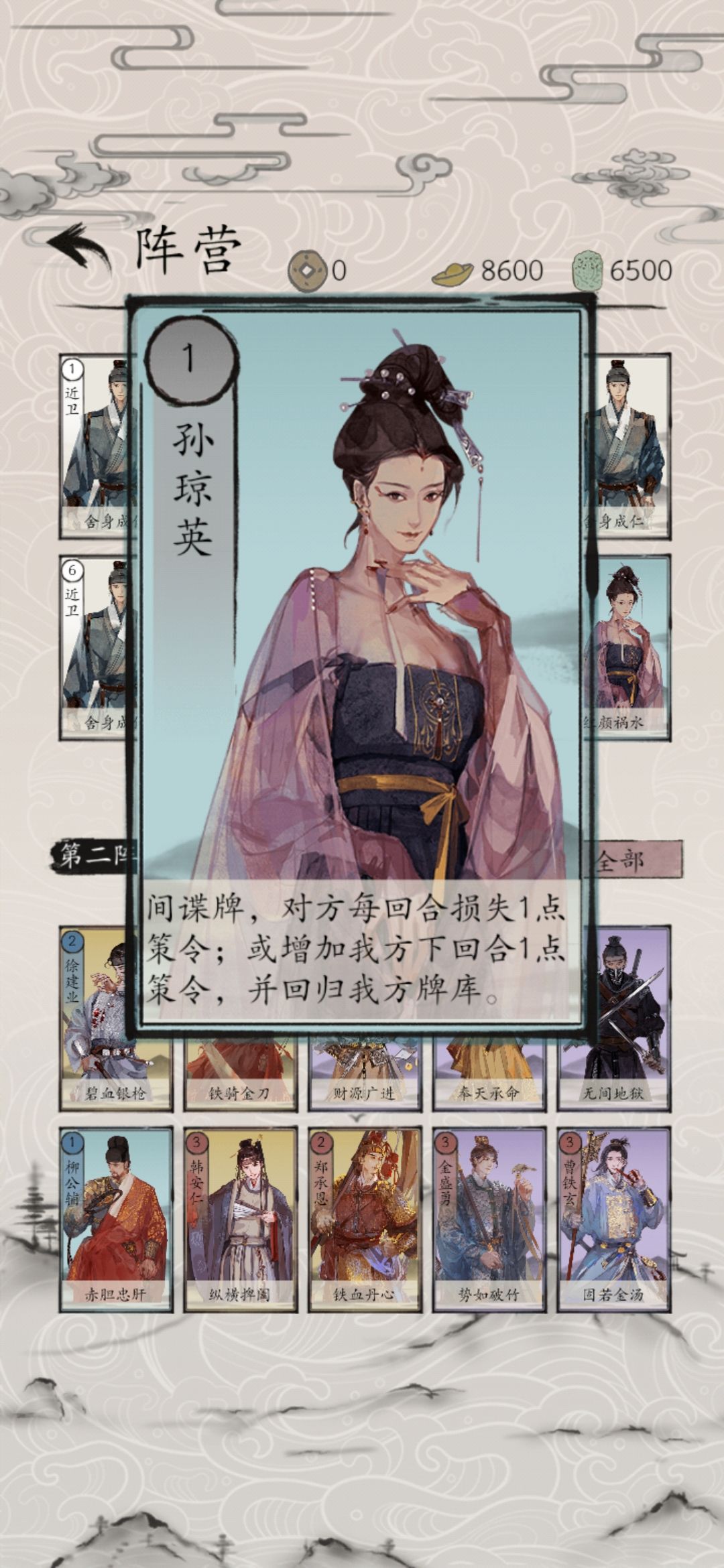 武侠卡牌冒险竞技游戏《包晓生英雄传》每周新英雄预告之孙琼英。“月夜柔情刀光冷,英雄葬在美人乡。”来自藩王阵营的孙琼英,是间谍卡组中的一张蓝色品质卡牌,不过她却具备良好的节奏控制能力,一起来看看她的实力吧。 孙琼英,外号女屠户,江湖上知名的一流女杀手,早期混迹凌霄楼,后来加入神相门。其武功技能为:“红颜祸水”,技能效果为:“打入敌方手牌,称为间谍牌,使得对方每回合损失1点策令,或增加我方下回合1点策