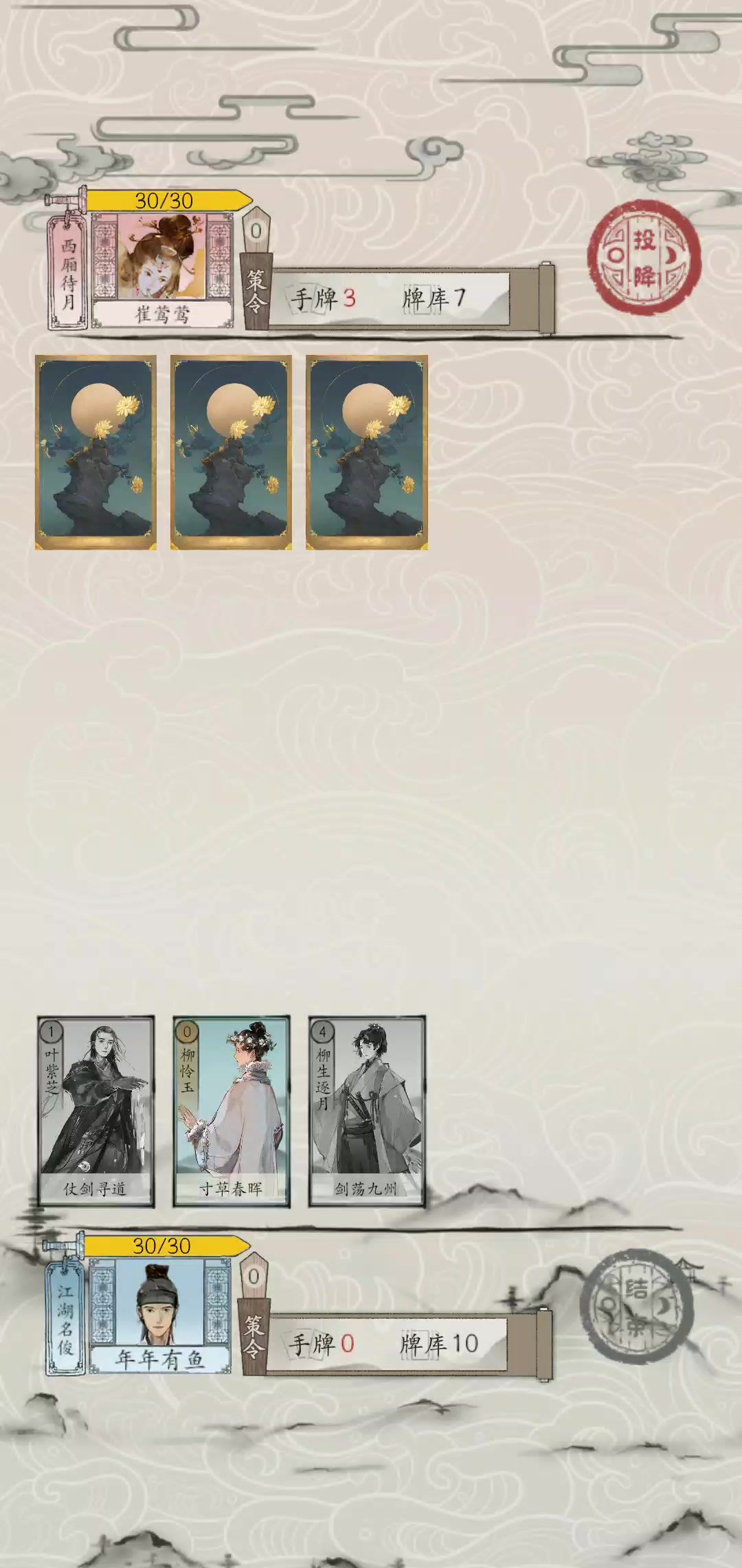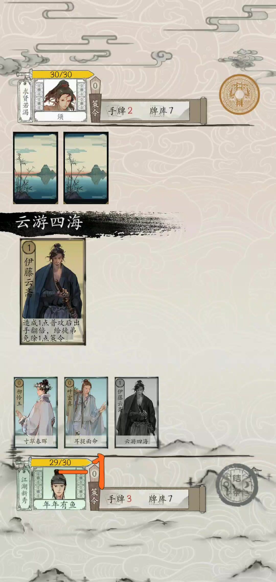 江湖新秀卡组柳香川卡组,第一战默认 无名之辈卡组 前两个卡组都是入门卡组主要用于帮助玩家理解游戏的玩法各种属性,正常组卡控下手牌打赢完全没有难度,这里就不过多赘述。 江湖侠客卡组 江湖卡组可以算是一个小门槛,很多不注意看游戏机制的玩家很容易吃亏,比如苗花奴的化蝶和马玉芝的驭虫只要点击技能图标就有效果显示,对面使用buff不要无脑出牌,也可以携带赵霓裳或许君羡直接驱散。(注意:只有绿色图标buf