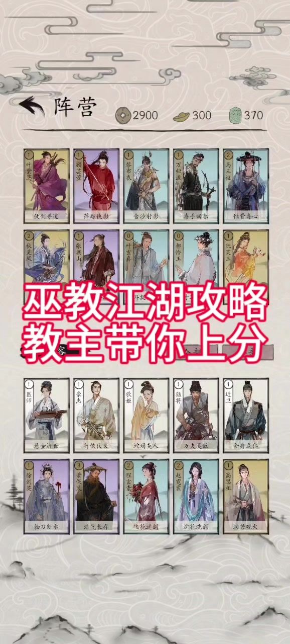 优点:这卡组几乎不怕任何人机,是推荐的上分卡组。缺点是怕真人用驱散针对,刚需是500声望兑换阮芙玉,其他三个蓝色教众一定等抽卡! 巫教江湖的基础卡组,是在初始江湖的基础上,去掉三小侠和颜寿民,换成巫教三教众,和教主阮芙玉,造价非常低廉,好用。#包晓生英雄传