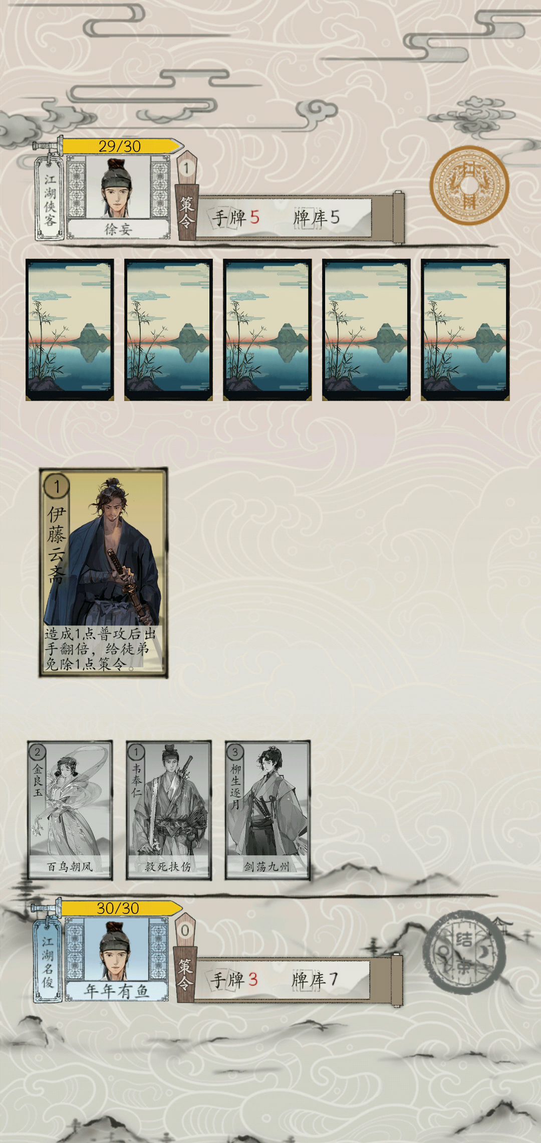 打法仅供参考第一回合 打伊藤给柳生减费,柳生留在手牌下回合可以召唤伊藤第二回合 打伊藤、叶紫芝,叶玄真、柳生留在手牌下回合可以召唤叶紫芝、伊藤第三回合 柳怜玉减费伊藤,继续打伊藤、叶紫芝,打金良玉回一口血防止对面斩杀第四回合 打伊柳结束战斗
