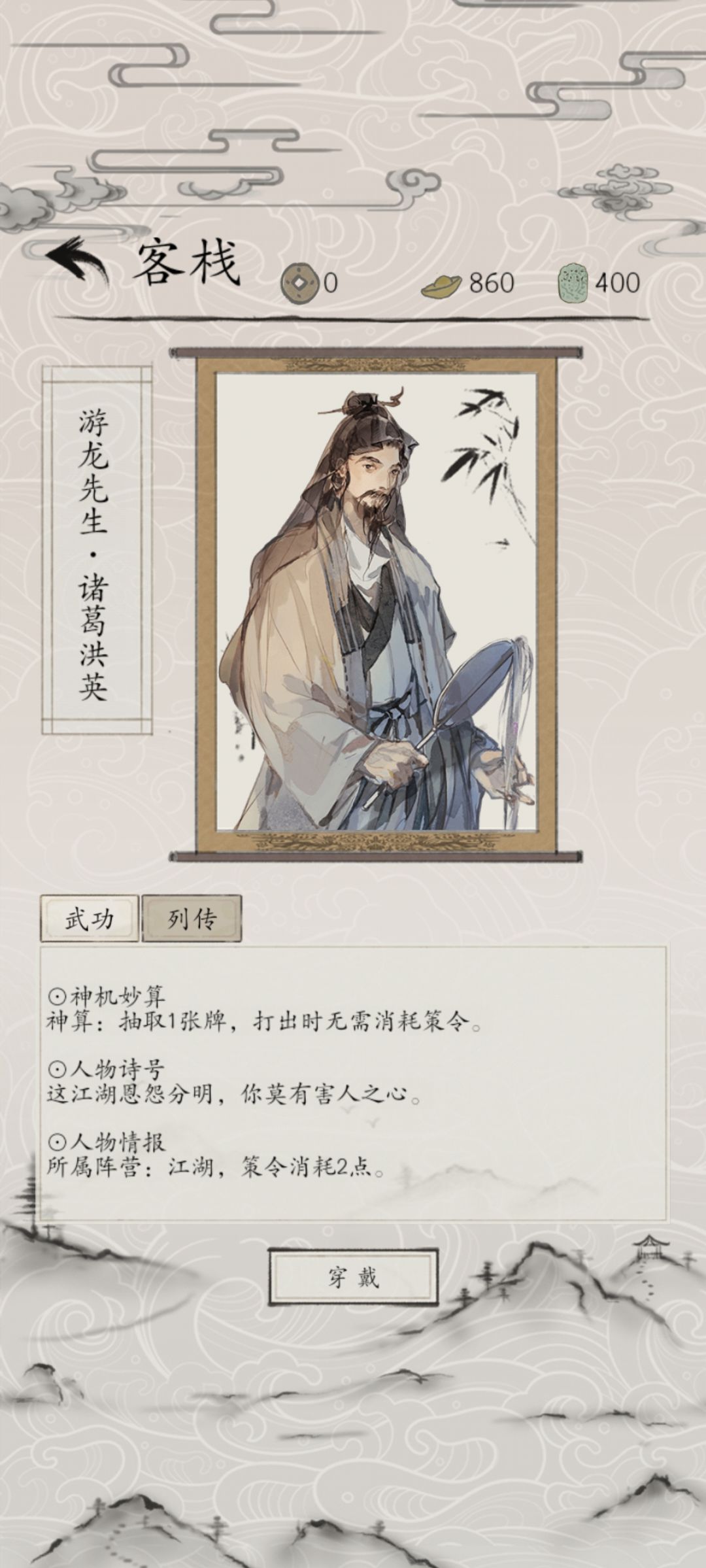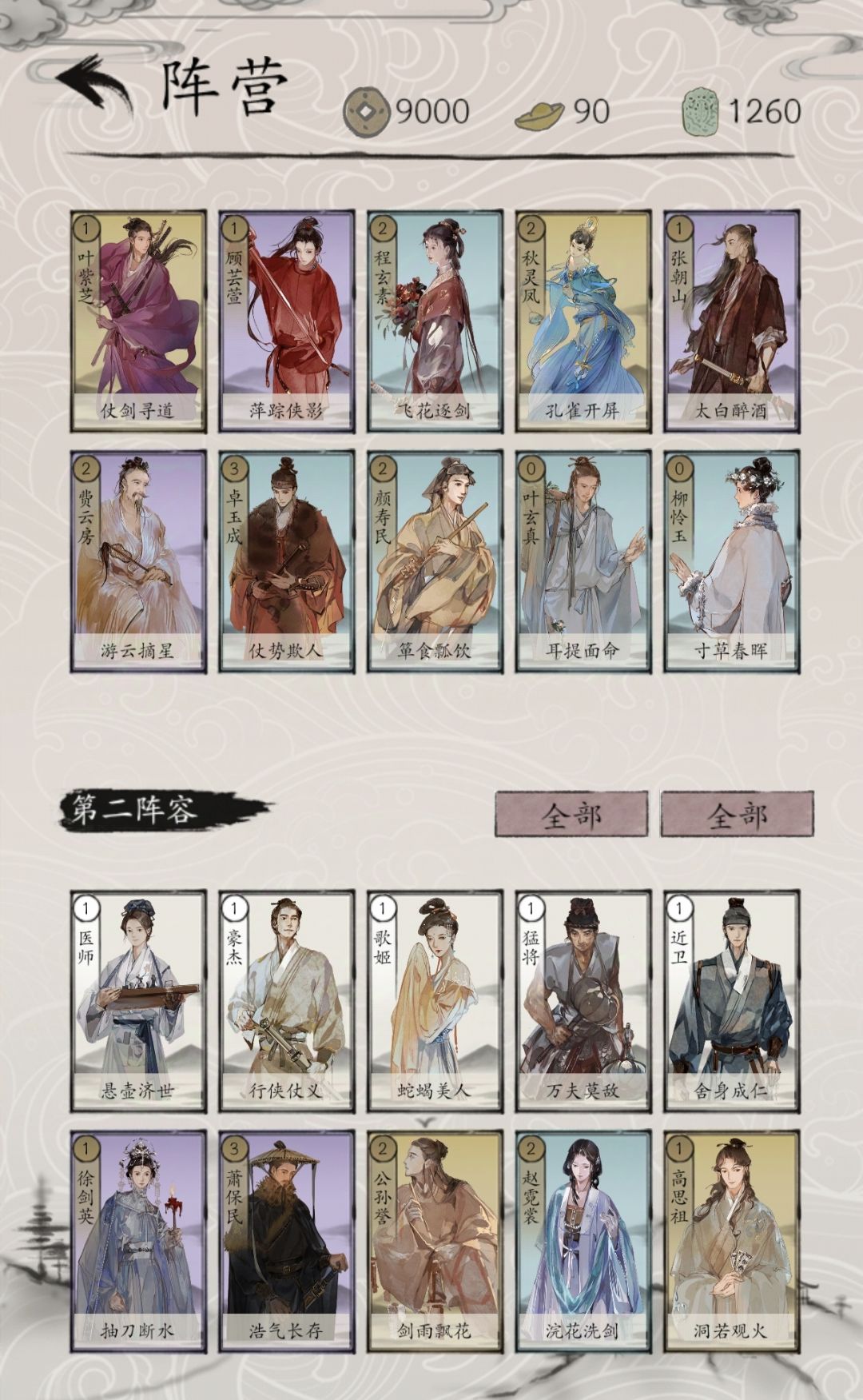 1.诸葛洪英:2费,抽1牌,使其无消耗。 技巧1:抽到的无消耗牌,克制一切加费牌,尤其克制俞广平。 技巧2:配合各种高费牌,赌命出奇迹。 技巧3:配合徐剑英,柳怜玉等减费牌,丝滑过牌。 加费牌有:欧阳贤,黄少钦,叶玄真(如图1),俞广平。 [图片] 高费牌有:4费,张九宫,菅原国芳,柳生逐月;3费,包晓生,沈仇英,胡炎烈,慕容殷,萧保民,梅君复,萧离情(如图2),呼延英,苗花奴。 [图片] 2.柳