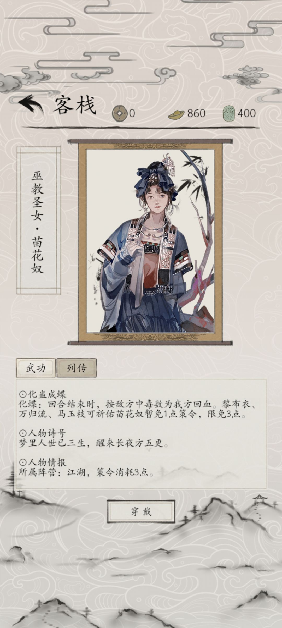 1.苗花奴:3费,回合末回敌毒等量血,减马玉枝1费,仅生效1次。 技巧1:配合巫教3人组,黎/万/马给减1费,有毒伤,有回血,叠毒速度较慢。 技巧2:配合朱观音,楼山雨,叠毒速度快,成型伤害,回血都高。 技巧3:极容易被自驱针对,其次禁疗,驱敌略微克制,反制手段为禁驱。 2.黎布衣:1费,2普攻伤害+等量毒,减苗1费,仅1次。 技巧1:配合周静若/陈祖礼/凌千绝,能够增伤,增毒。 技巧2:不要打救