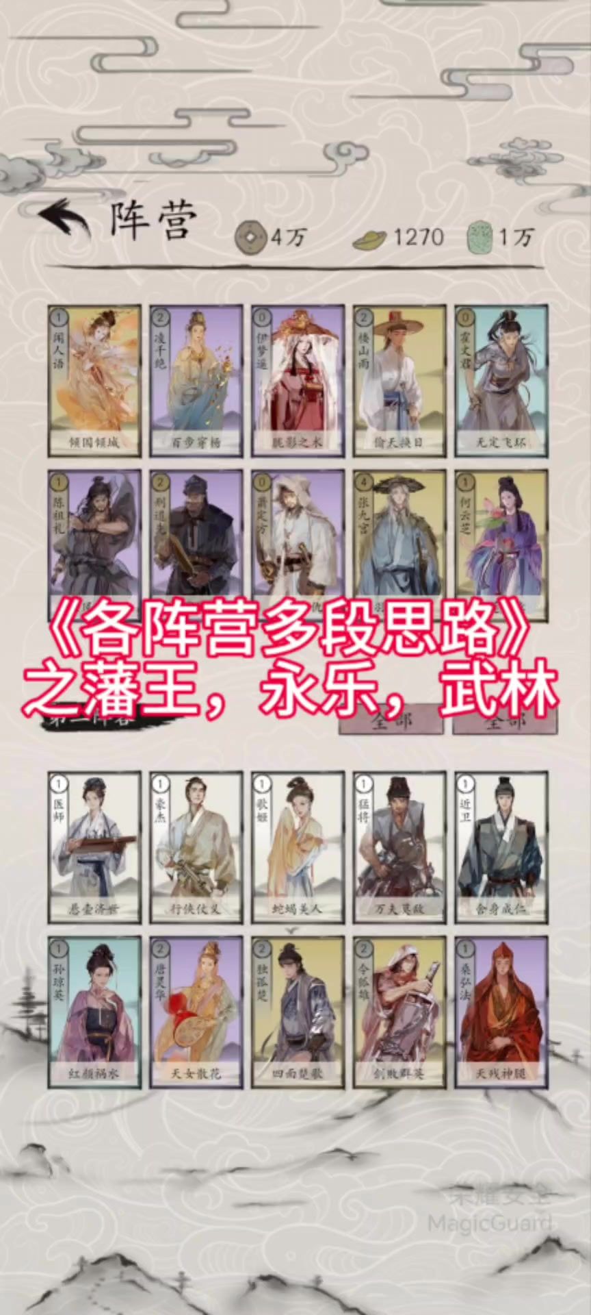 虽然状态栏都有写,但是由于本游卡牌众多,很多玩家刚入坑时对各种机制的了解有限,故想简单介绍一下各种词条、buff、机制的作用。[表情_思考][表情_思考] (2025年9月更新) 一、基础机制 1、阵营♞:本游有永乐、建文、藩王、武林、江湖五个阵营,其中前四大阵营卡牌不通用,而江湖阵营除柳玲玉、叶玄真外其他卡牌全阵营通用。(很多萌新问为什么我买了卡牌用不了呢,这就是因为阵营卡牌不通用) (不同阵营