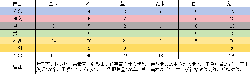 上图为本游戏初始资源汇总,虽然福利比较多,但新人玩家不熟悉游戏前期开荒还是比较困难的,接下来就给大家提供一套开荒的方案。 首先,资源要合理使用(抽卡概率为金卡2%、紫卡10%、蓝卡86%、红卡随机,额外还有2%金保底和10%保底的独立保底机制,抽卡数可以在驿站看到统计),除开荒必备蓝白卡,其余声望优先兑换金卡(购买英雄可以参考最新卡组推荐帖,不建议胡乱购买组卡),元宝和铜钱用来解锁凌霄楼与兑换红