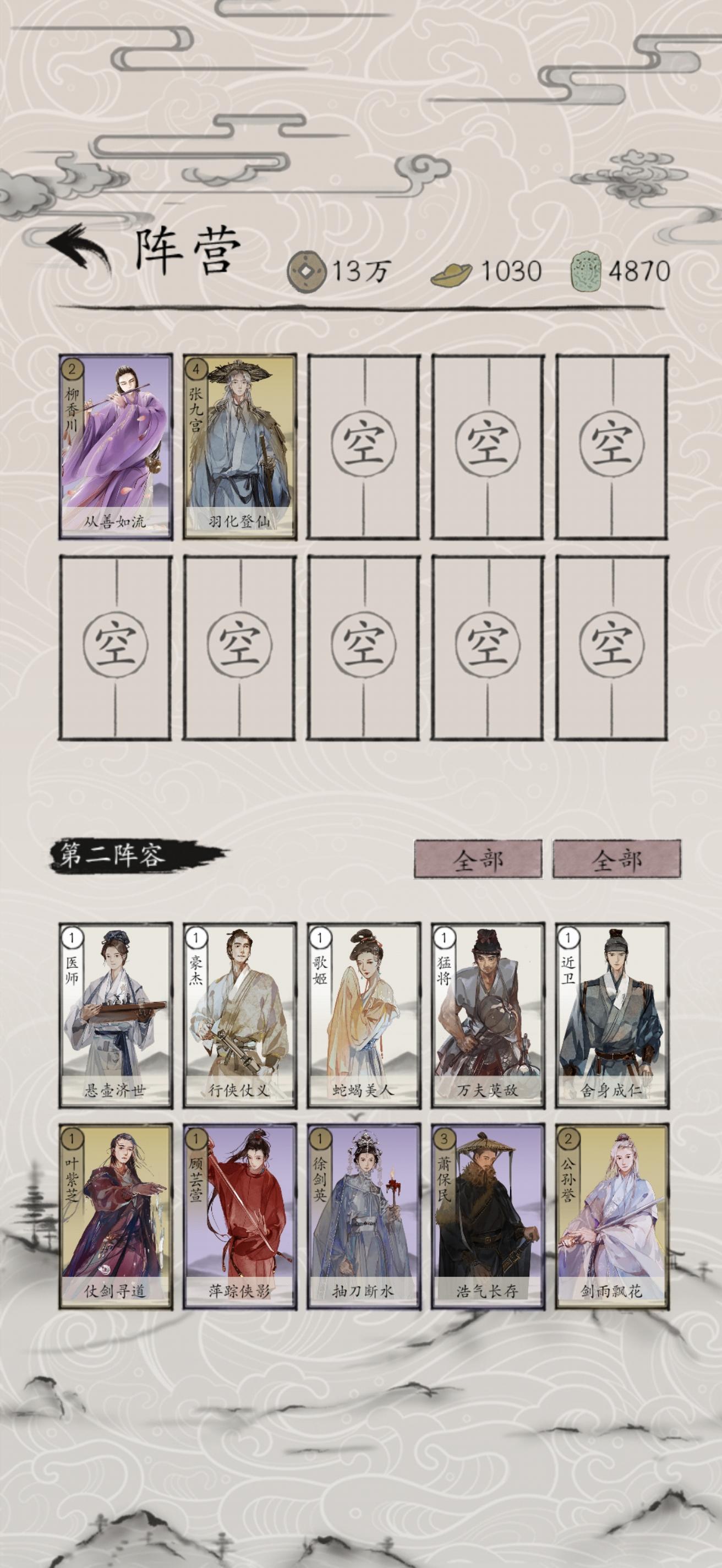 开局记得领取叶紫芝(抽卡)、顾芸萱(签到)、秋灵凤、张朝山、雷奉宣(副本),史存孝、雷海蟾、金良玉、颜寿民、叶玄真、柳怜玉。可以组成初始江湖和复制卡组;初始江湖可以先去关卡通关包晓生英雄传本传,通关副本后,可将元宝和铜钱全部用来抽卡,收集推荐卡组角色。注意缺失金卡可以考虑声望获取外,紫卡和蓝卡非必要则尽量等抽卡获取。江湖三件套能够应对PVE和PVP,初始江湖、星宿江湖和假象江湖在天梯都比较好用,