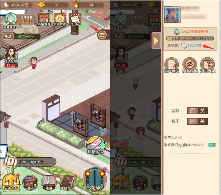 HI~亲爱的古董家,正式上线已有些许天了,总觉得好像少了点什么。emmmm少了什么呢?对~少了攻略,于是小编连夜硬搞~可能有点潦草,但是纯自发自内心之言啊!!!希望各位古董家可以看看哈,大神勿喷啊~毕竟小编内心十分脆弱%>_<%一、掌柜、店员升级可增加店铺的收益,店员和掌柜均可花费钞票进行升级,掌柜达到一定等级,需要使用金条突破,突破后即可继续升级 二、已激活的店铺达到一定人气可花费钞票采购更
