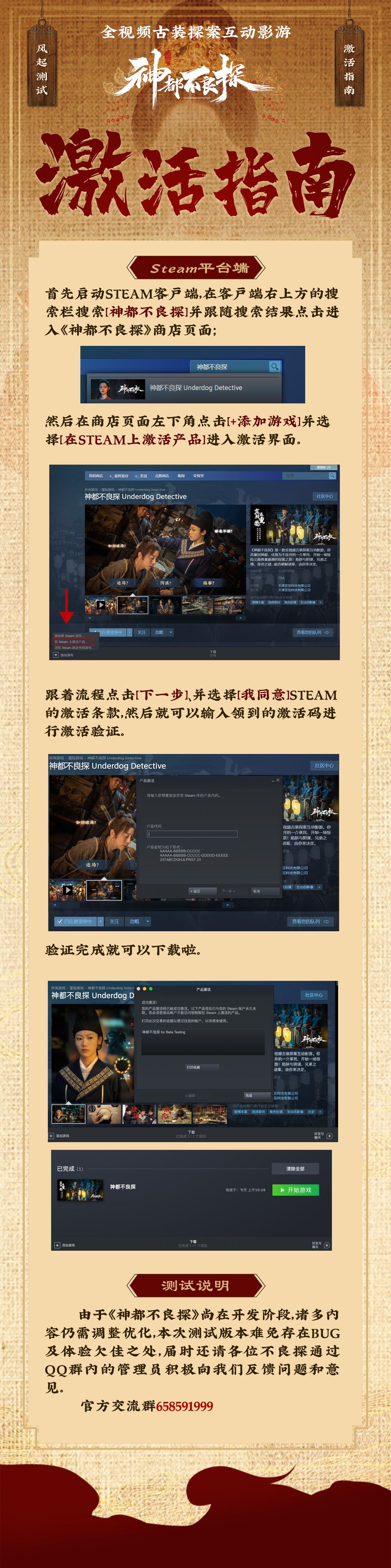 各位不良探: 神都之神,皆在于人! 《神都不良探》首次限量风起测试准备就绪,激活码也将如约发放给已经获得资格的先锋不良探手中。为辅助各位先锋不良探尽快奔赴神都探案,探宝特将激活流程奉上,请各位仔细观阅。 Steam平台的老规矩,激活分两种方式。一为Steam客户端直接激活下载,二为Steam网页激活下载。以下是详细流程: 方式一:Steam客户端直接激活下载。 首先启动Steam客户端,在客户端