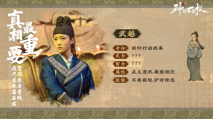 联昉唯一女性执事来啦!作为朝廷重部联昉唯一女性执事的武越,有着正义凛然、果敢刚烈的性格。虽然出身高贵,却不愿沉溺于享乐之中,立志铲奸除恶、维护正义。有着明确目标的她,不畏强权、不惧黑暗、不在乎高低贵贱,只为追求正义和真相。