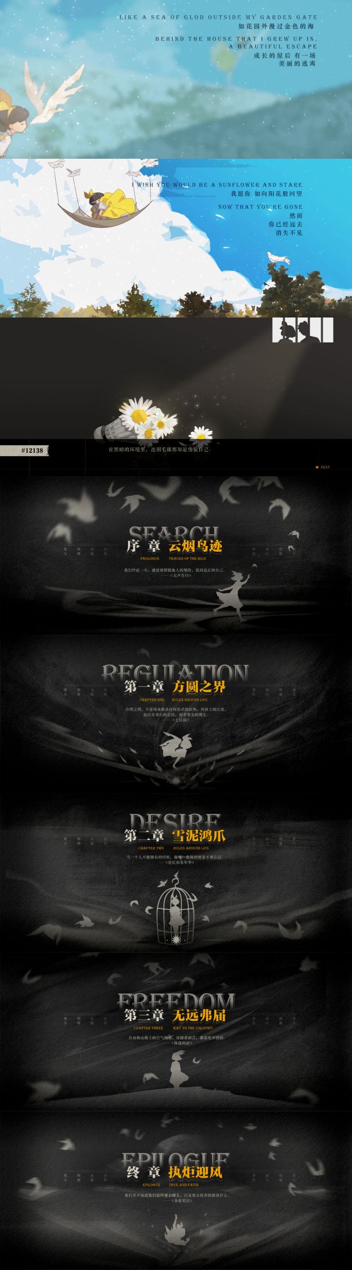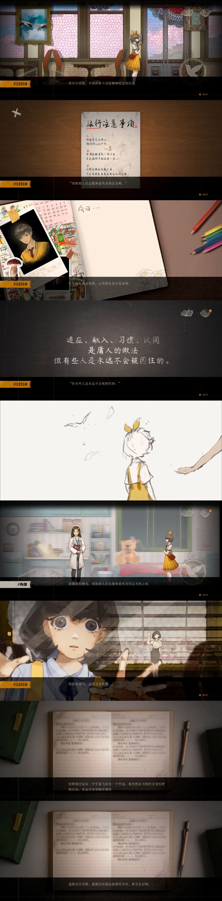 画面绝对没得说,很精细很美丽,有很多细节,氛围烘托也很不错,哥哥在向日葵用鸽子头看向主角时真的有点被吓到了。哥哥的自由头是鸽子(还是鸟?)我感觉这种设计是有深意的,可能象征着即使他长出自由头心底仍有一丝对真正自由的向往?场景很美丽,但可能是受剧情限制没有特别多张,很多都是重复的,不过后面一些很惊艳很好看。