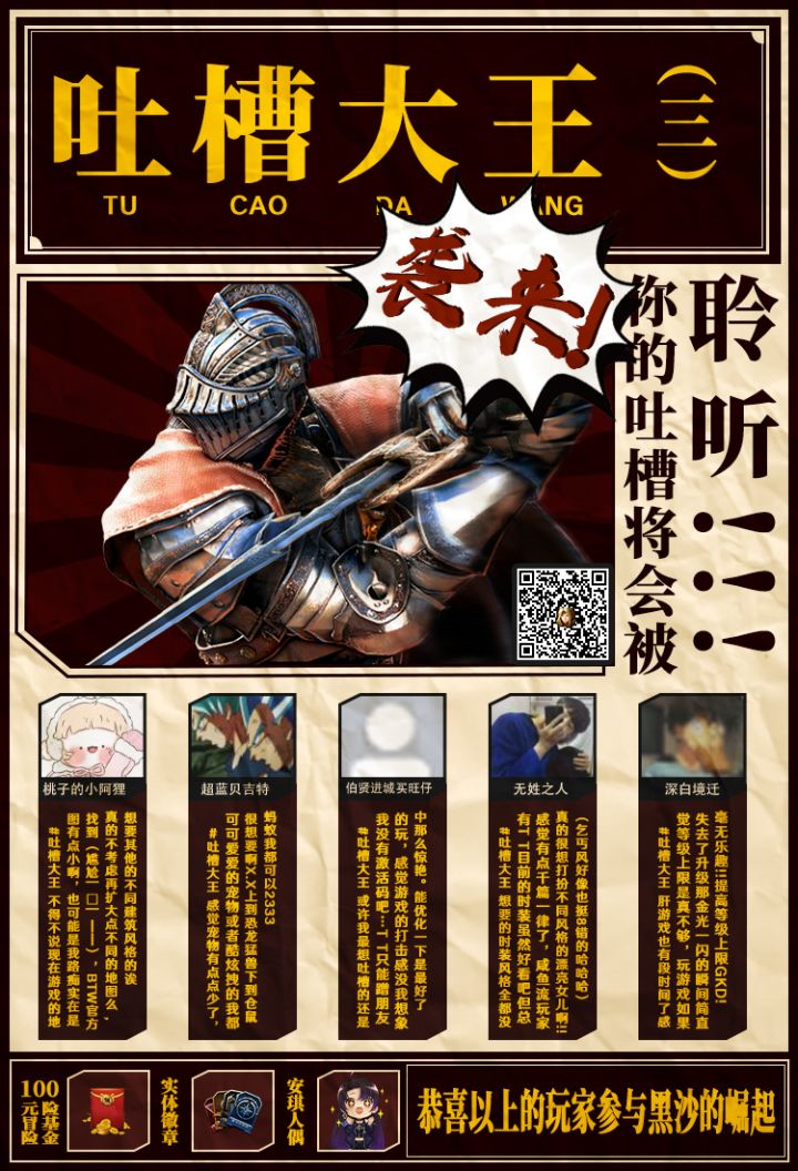 嗨,冒险家们,我是黑沙策划安琪!欢迎大家来到第三期也是最后一期崛起计划的颁奖,感谢大家一直以来的参与~终于!吐槽大王bug征集活动第3期名单也出炉了!秉承着“不吐不快”的先进理念,各位吐槽大王们几乎把游戏翻了个底朝天!也多亏了大家的努力,安琪可以在游戏公测之前收集尽可能多的bug提交至开发。大家的反馈会尽快处理修复的!感谢各位冒险者的鼎力相助!现在安琪宣布:吐槽大王第3期获奖名单公布!一起