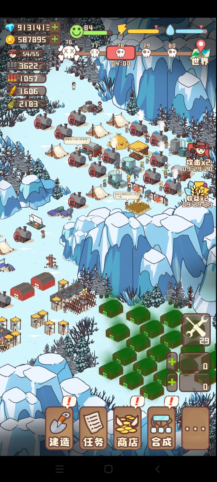 两个水站,4个都是水加成的人民工作。然后三块蘑菇田,三个烤架烤蘑菇,3个农民,和3个食物加成的人民。两个守卫编队,每个编队1狙击+3步枪,有实力可以2狙击+3步枪。然后一队守,一队推进。现在主要就是电站太贵了,还有仓库经常满食物,要一直建仓库和电站
