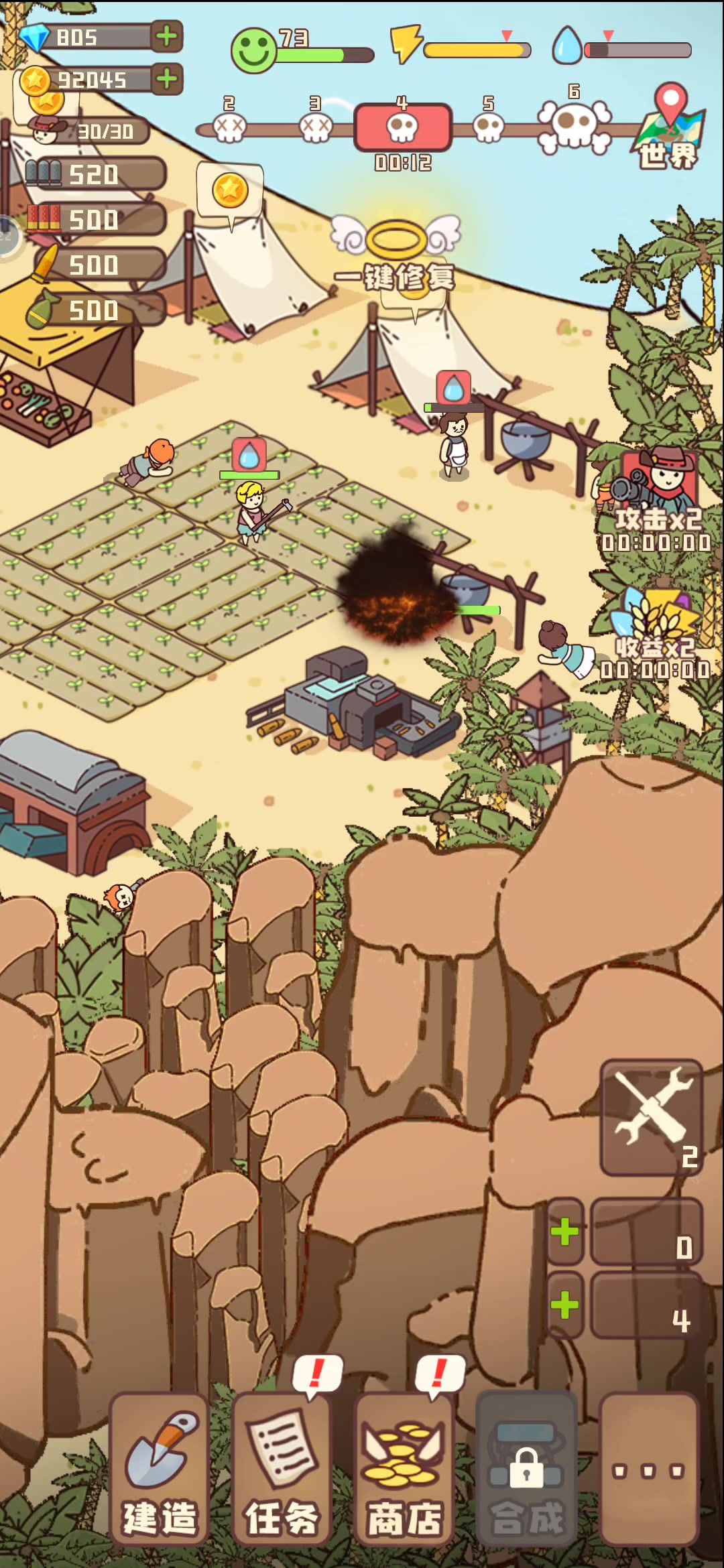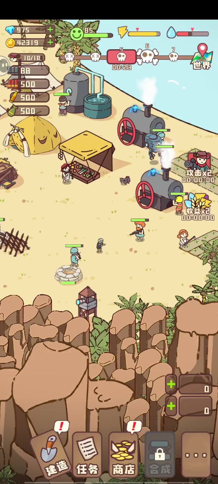 两个水站,4个都是水加成的人民工作。然后三块蘑菇田,三个烤架烤蘑菇,3个农民,和3个食物加成的人民。两个守卫编队,每个编队1狙击+3步枪,有实力可以2狙击+3步枪。然后一队守,一队推进。现在主要就是电站太贵了,还有仓库经常满食物,要一直建仓库和电站