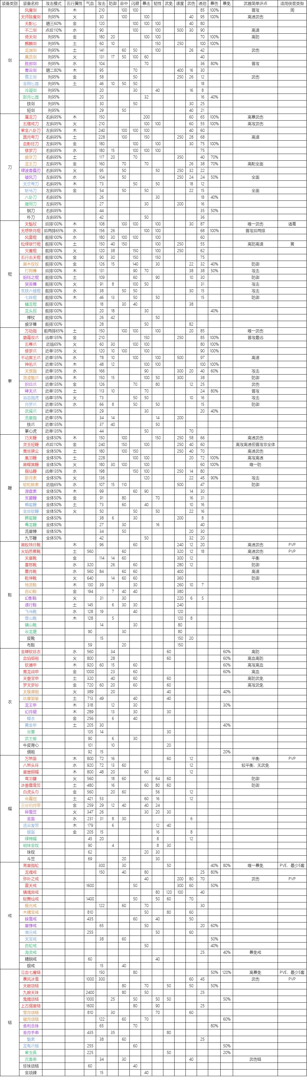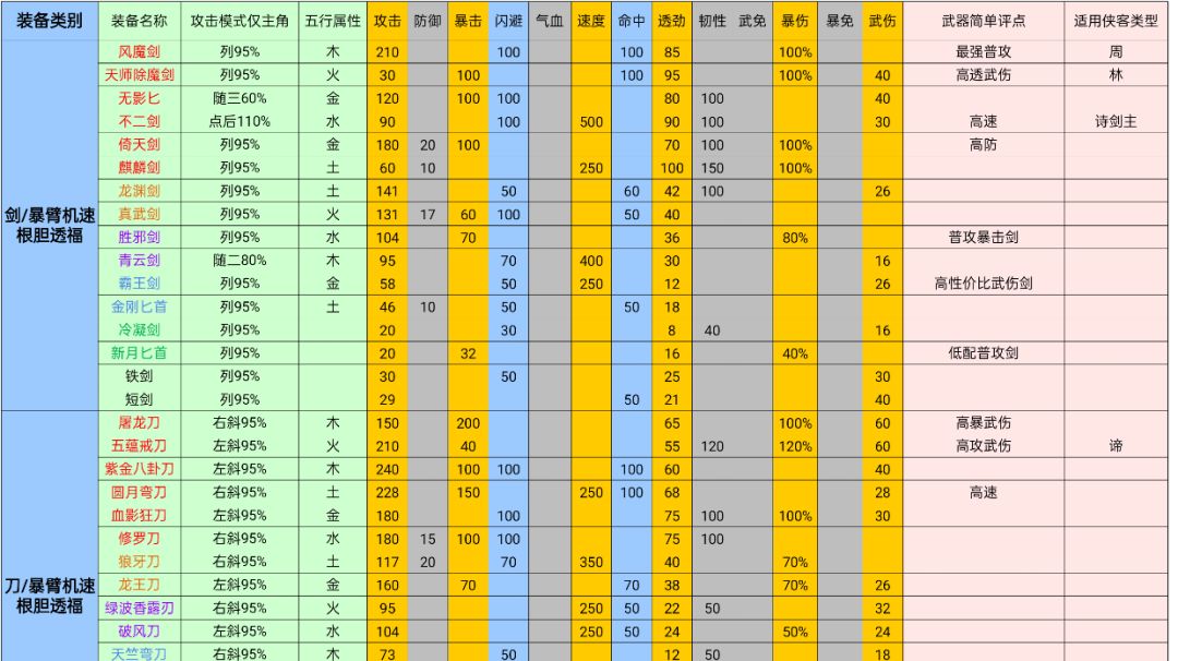 本攻略旨在帮助新手入坑,为月卡零氪党提供侠客优先级,装备分析推荐,侠客行通天攻略及元宝银两新手活动运营参考,点赞多的话长期更新(申精没回应看的人还少[表情_叹气]不想更辣) 文档是dc上大佬一年前发的,经过版本更新数据改变了,我对常用装备进行校对修改,并更换属性列的顺序与游戏内一致,每列颜色也作了区分,以便查找。 图中攻击属性为橙黄色,防御属性为灰褐色,闪避属性为浅蓝色。 另左侧添加副词条指示,右