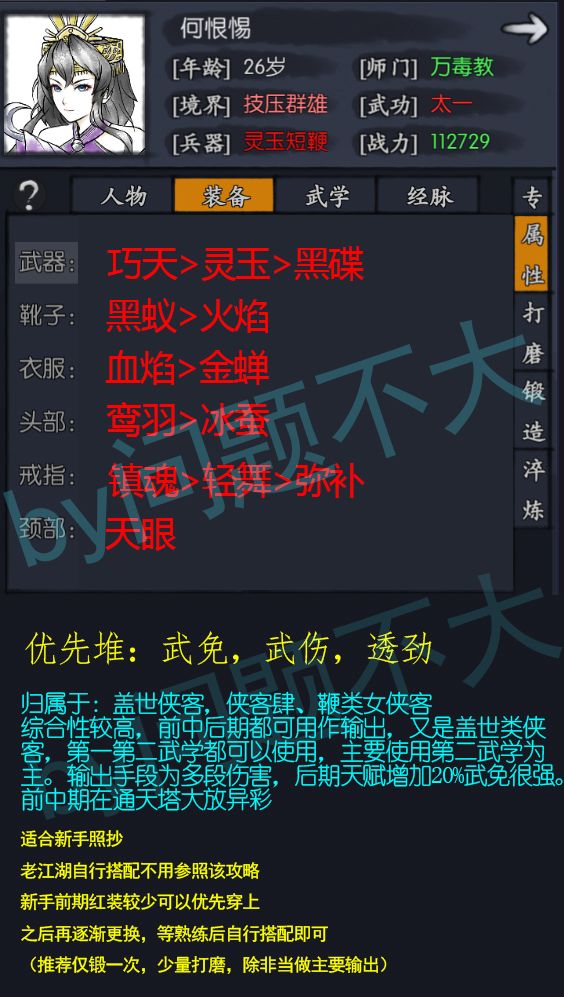 随便写点小攻略吧 这个游戏不是颜色越高 装备就越好的 具体还要看属性 如果你想玩武伤的话 比如月剑 前期蓝色的霸王剑是比较适合的 比紫色的剑都要好 具体是看攻击 透劲 武伤 首饰的话有个绿色的比蓝色的属性都要好 又便宜 所以前期装备的时候注意看装备属性 以及他锻造的性价比 如果你是暴击普攻流 就要看爆伤 现在这个版本虽然爆伤的属性很高 但是 命中很看脸 容易被一些闪避流的武将克制 但是无论你玩什么
