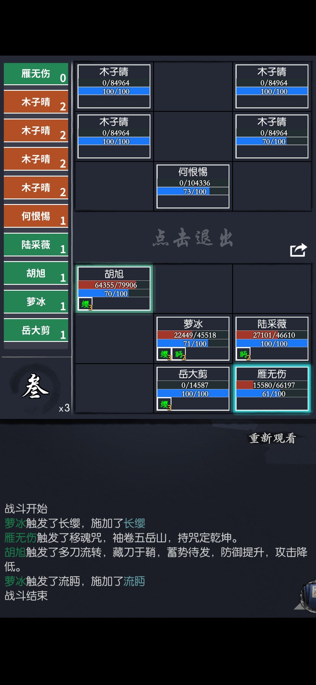 伤害触发很快建议一倍速凹 后面有小林,前排一定要顶住(八宝主,锁血胡) 这里很恶心,第三回合uu小林一起发力一个打一列,一个打后排 想降低损伤得三回合内尽量降低敌方血线 如若伤害不够首先前排得扛住 后排输出可以用小何免疫一下持续伤害 或者奶妈抬血 后排两鞭子抽人很疼 胡+霄可以在地方释放武学前击杀通用 解决两个辫子的剩下的就很简单 最后一场多人战斗 上官齐uu都会扫荡后排,后排可以补个肉 击杀顺序