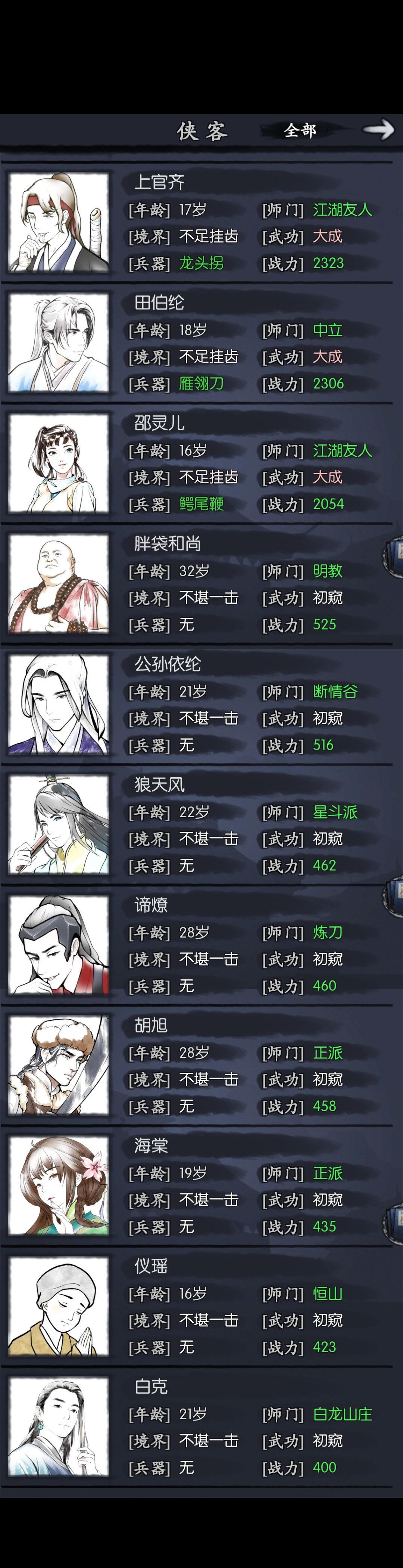 阵容在图三 过渡思路写在11楼了 内测玩的月门,这次就主角换了武当流浪开荒还是用的其他四个人,开荒胖仔客和仪摇都是豪杰需要的信物资源都便宜。队伍里三个人都是剑角色历练第一关就是剑方便挂机。 前期资源少(本人氪了几十) 卡关时暴击和闪避这两波动大的就是好属性 主要就练两人,一个主角,一个胖仔客。 主角走暴击流,配装在图五,装备带加暴击暴伤的,紫色胜邪剑可以用很久,紫装可以适当用灵木洗一下,臂力,穿