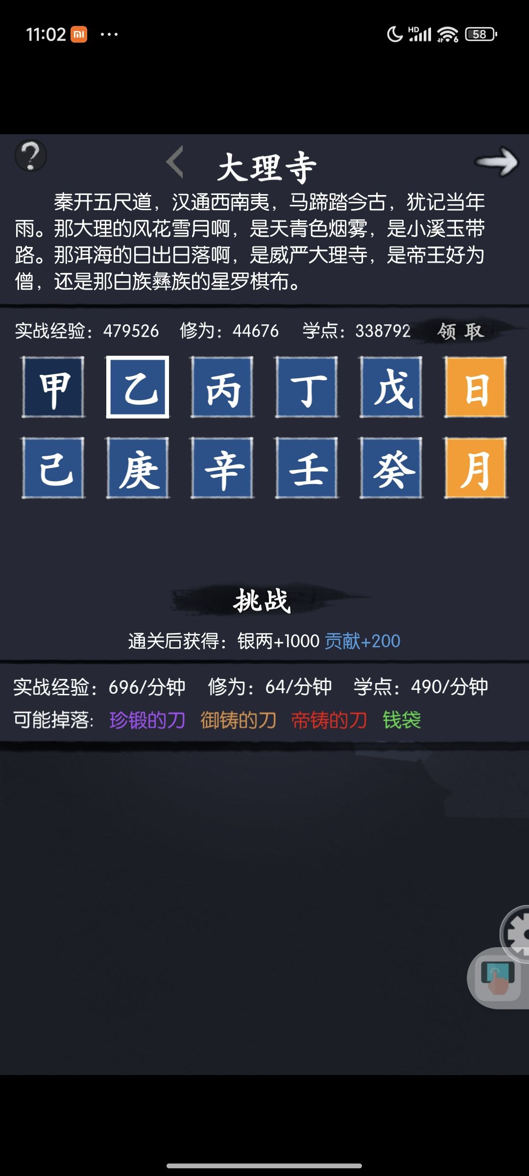 P1-历练界面说明 P2-示例界面说明 1、历练最多只能屯24小时的奖励,离线也可以屯 2、日月装备爆率比甲乙那些低,而且种类不固定,但胜在有精研录和修习录,如果没有特定要挂某一种的才推荐挂 3、历练每个小关(甲乙丙丁)挂取的实战经验这都都不同,逐渐递增,但最后两大章历练(夜长安和承天井)章节内每个小关的实战经验修为是一样的。 4、类似行军和调息都属于历练挂机收益加成的道具,但对其他道具和装备爆率