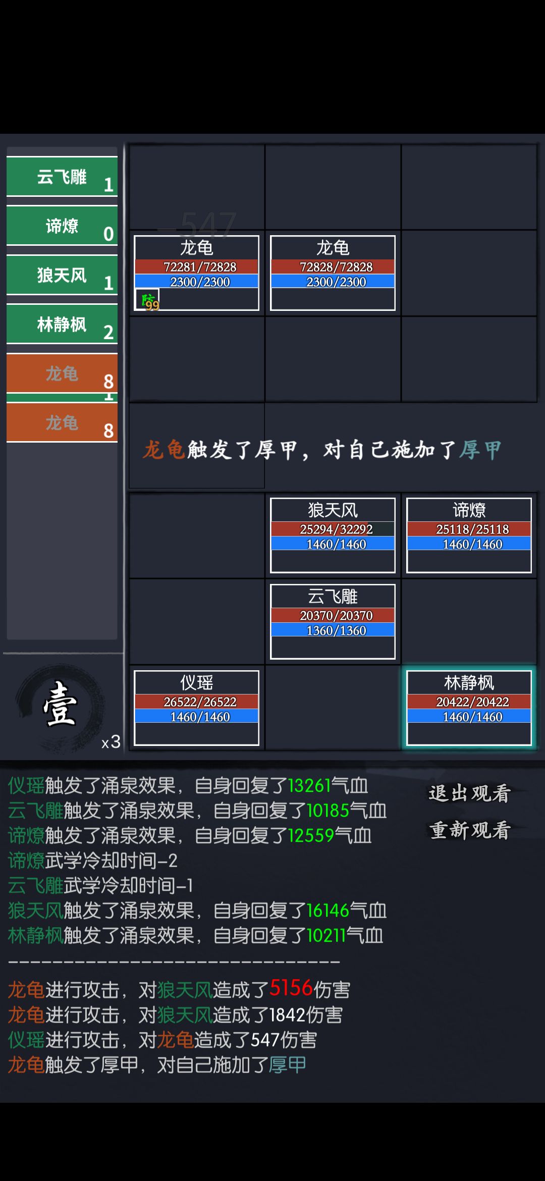 48层两只龙龟,技能回血50%,有公孙反疗好过一点,没有的话可以试试我这个阵容 狼天风最好堆点暴免,我还没怎么堆暴免实验一下竟然过了 主要利用依琳、林静枫封穴,云飞雕沉默,让龙龟放不出来技能,当然,最重要的是有一个高攻血刀流血输出(今天重置通天塔随机到140%攻击力,血刀输出直接炸裂) 补充:依琳用二技能,主要提供回蓝 49层主角用猿猴棒法,自身暴免+猿猴棒法提供的暴免累积堆到340%以上,对面普