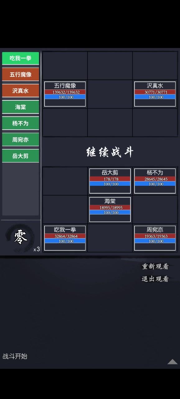 要点:熬到大龄,然后没了。 要不怎么硬抗魔像嘛,能用的全用上啦,谁都没浪费! 这关是目前为止我遇到的最难的一关,要不是有魔像的武学压力,我大概要掏出打熊熊的小连招来处理魔像惹。 唯一能用的技巧大概就是,素素如果也中了妄的话,冬雨是按格子顺序来解的。过儿站3必须得解掉,要不回头一拳妹妹就没了,主也必须得解掉帮魔像加cd,周姐嘛...解不解也不耽误我周姐摇花手。